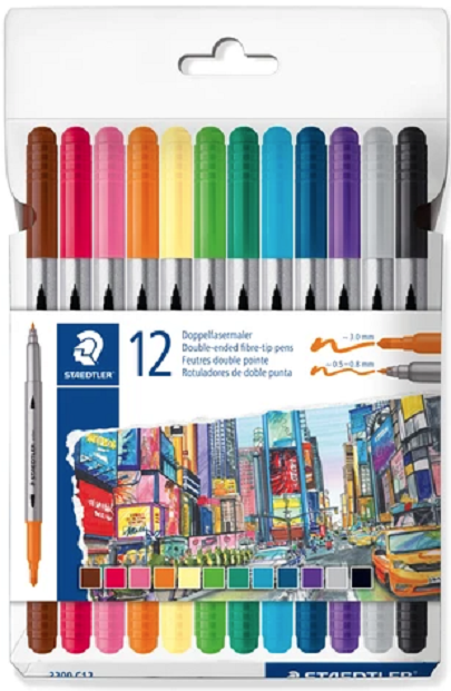 Setul de 12 carioci cu doua capete de la Staedtler este conceput pentru creativitate fara limite. Fiecare carioca este echipata cu doua varfuri rezistente la presiune, unul fin, cu grosime de aproximativ 0.5–0.8 mm, si unul mai gros, de aproximativ 3 mm, ceea ce permite realizarea atat a detaliilor precise, cat si a suprafetelor colorate uniforme.