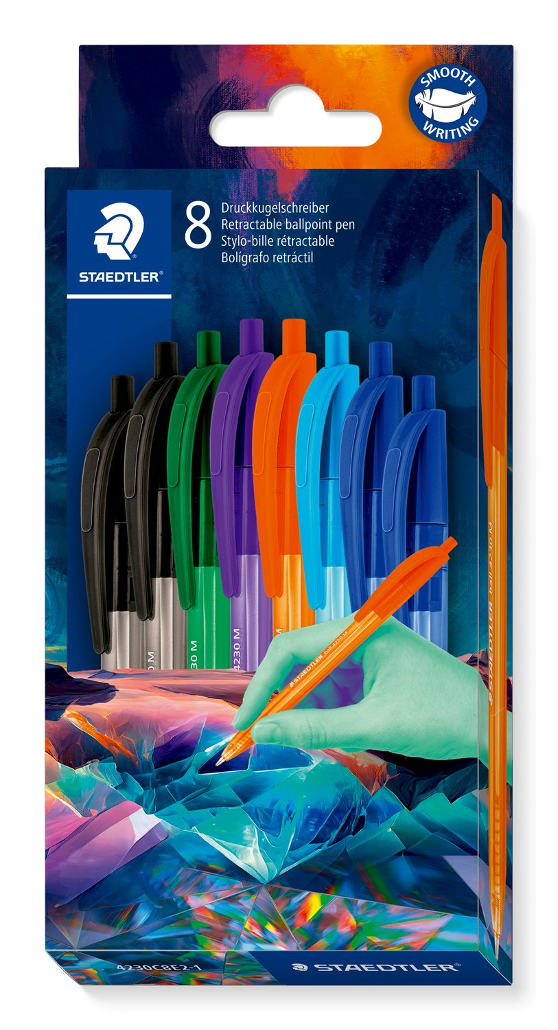 Setul de 8 pixuri Staedtler include pixuri retractabile, confortabile la utilizare, cu scriere lină și precisă. Designul modern si culorile variate le fac potrivite pentru scoala, birou sau uz zilnic. Pixurile au mecanism cu buton si grosime medie de scriere.
