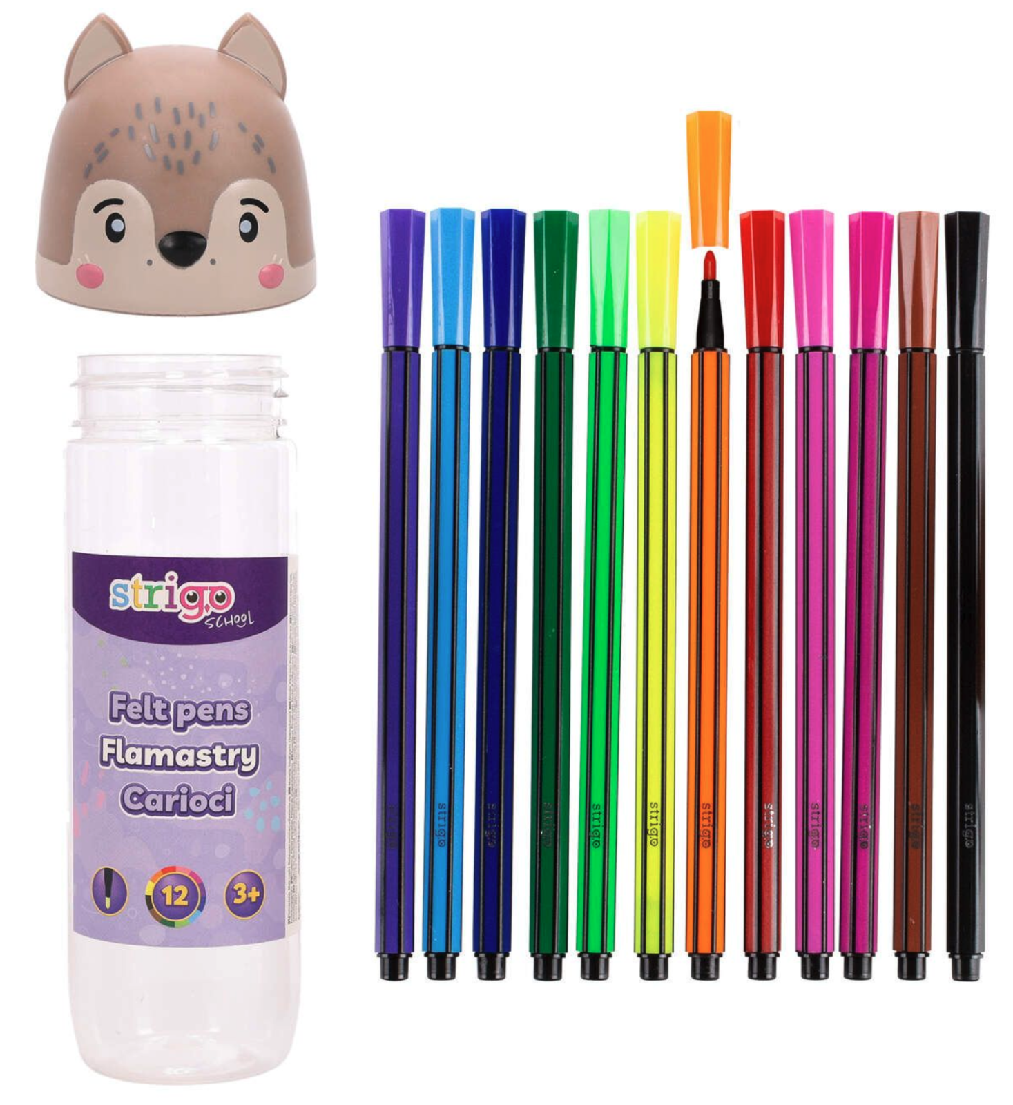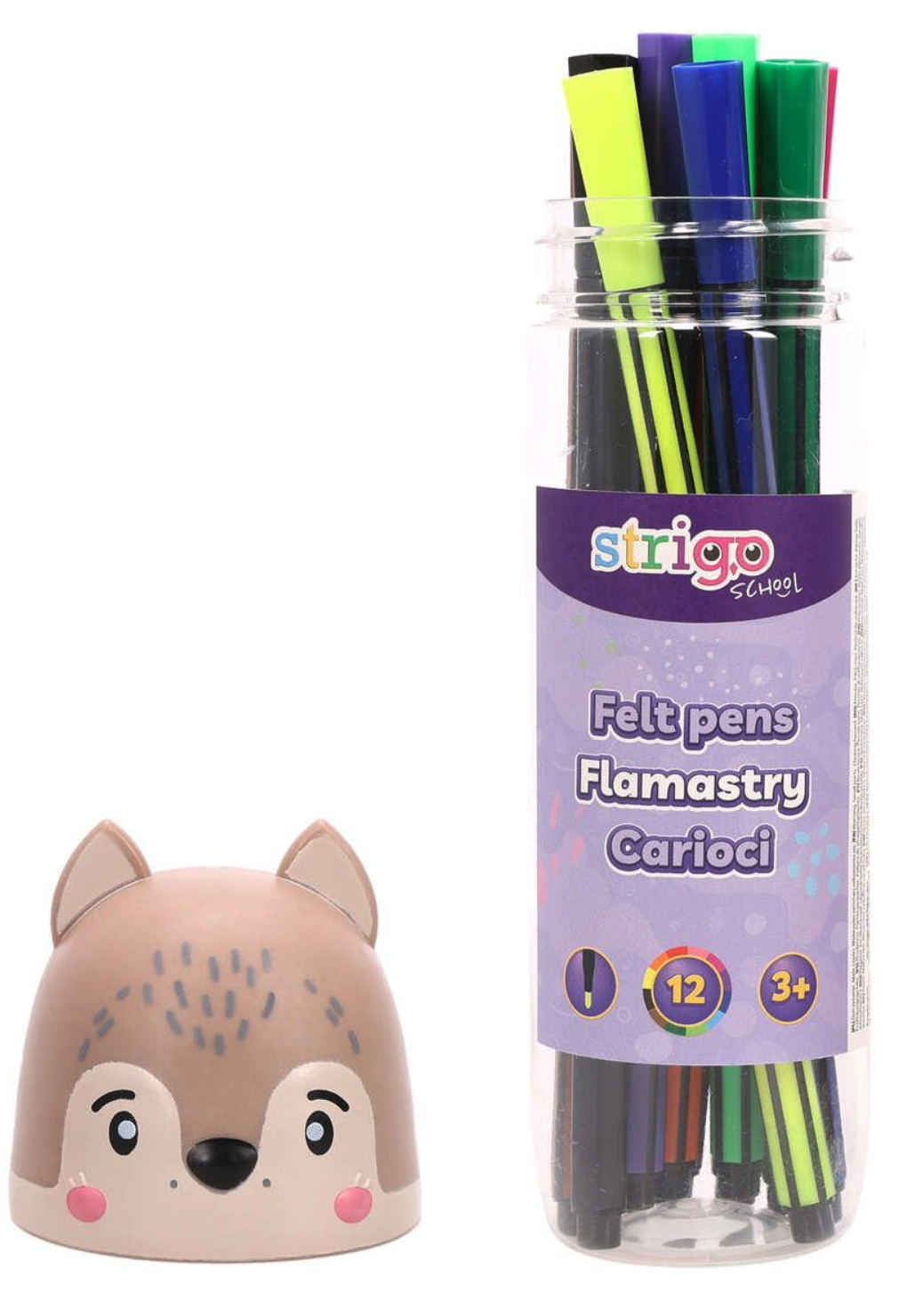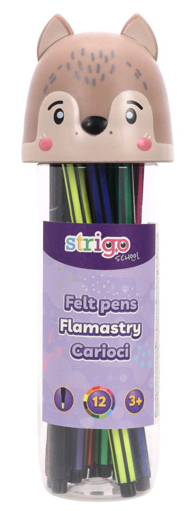 Setul de carioci Strigo cu 12 culori vine într-o cutie practică, cu capac decorativ în formă de lup, care face desenul și mai distractiv. Cariocile au culori vii și sunt ușor de manevrat de mâinile copiilor. Sunt ideale pentru desen, colorat și activități creative acasă sau la grădiniță.