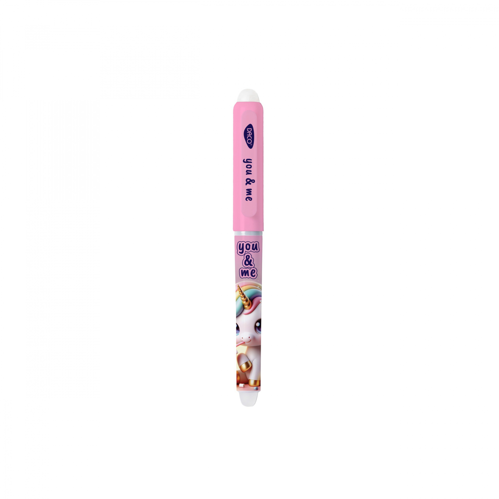 Stiloul cu radieră DACO You&Me – model Unicorn este alegerea ideală pentru fetițele care iubesc magia și poveștile. Cu un design roz pastel, decorat cu un unicorn adorabil, acest stilou îmbină frumusețea cu funcționalitatea, transformând scrisul într-o experiență plăcută și relaxantă.