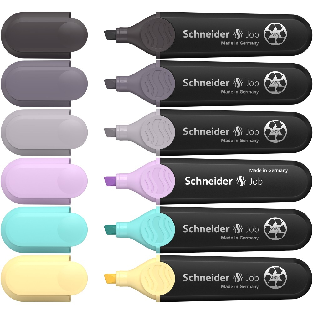 Setul conține 6 textmarkere Schneider Job în culori pastelate, inclusiv gri. Sunt potrivite pentru evidențiere clară și uniformă, atât la școală, cât și la birou. Designul modern este complet de materiale ecologice și cerneală de calitate.
