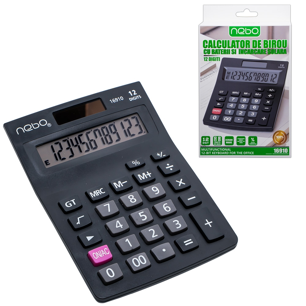 Calculatorul de birou NEBO cu 12 digiți este ideal pentru calcul rapid și precis. Afișajul mare și alimentarea duală asigură confort și fiabilitate în utilizare zilnică. Este potrivit pentru școală, birou sau activități administrative.