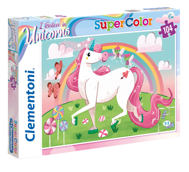 Puzzle-ul Clementoni I Believe in Unicorns, cu 104 piese, îi poartă pe copii într-o lume plină de culori, curcubee și unicorni fermecători. Dimensiunea finală a puzzle-ului este de 48,5 x 33,5 cm, oferind o imagine luminoasă și atrăgătoare, realizată printr-o tehnică de imprimare exclusivă ce redă detalii clare și culori vii. Piesele sunt fabricate din carton de calitate, rezistent și sigur pentru cei mici. Acest puzzle face parte din colecția SuperColor, concepută pentru a sprijini dezvoltarea atenției, gândirii logice și a abilităților manuale, transformând fiecare moment de joacă într-o experiență educativă și plină de distracție. Potrivit pentru copiii de la 6 ani în sus.