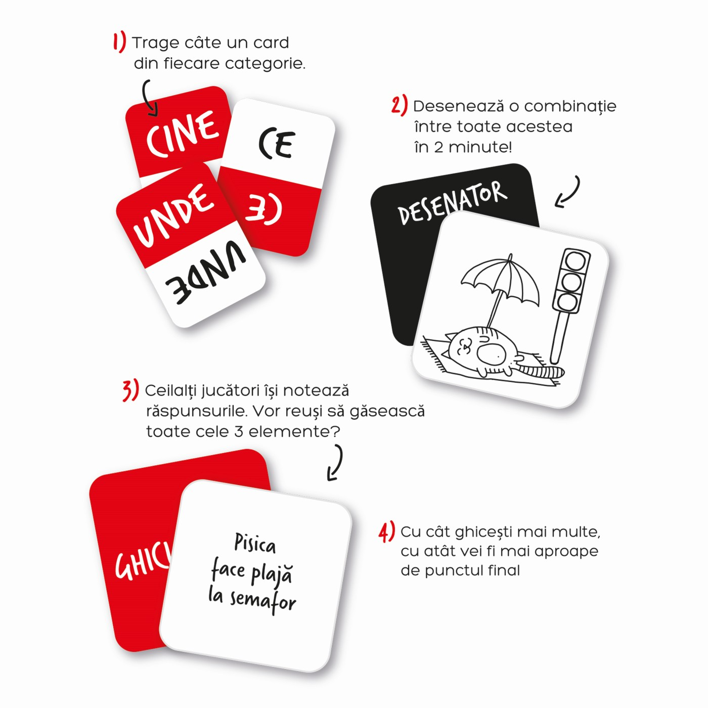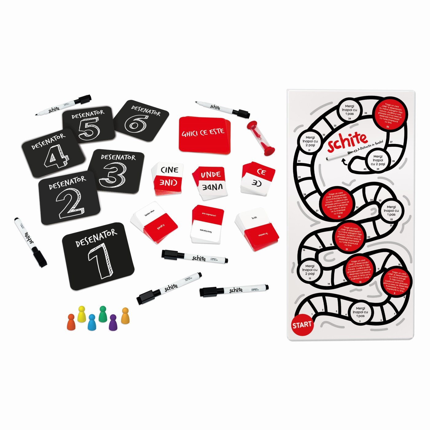 Incearca sa-i faci pe ceilalti sa ghiceasca ce desenezi si o sa radeti cu lacrimi! Cine ajunge primul la punctul final? Jocul include: 1 placa, 6 file de schite, 6 file Guess it, 150 de carti cu 300 de teme, 1 clepsidra, 6 piese, Brosura de instructiuni.