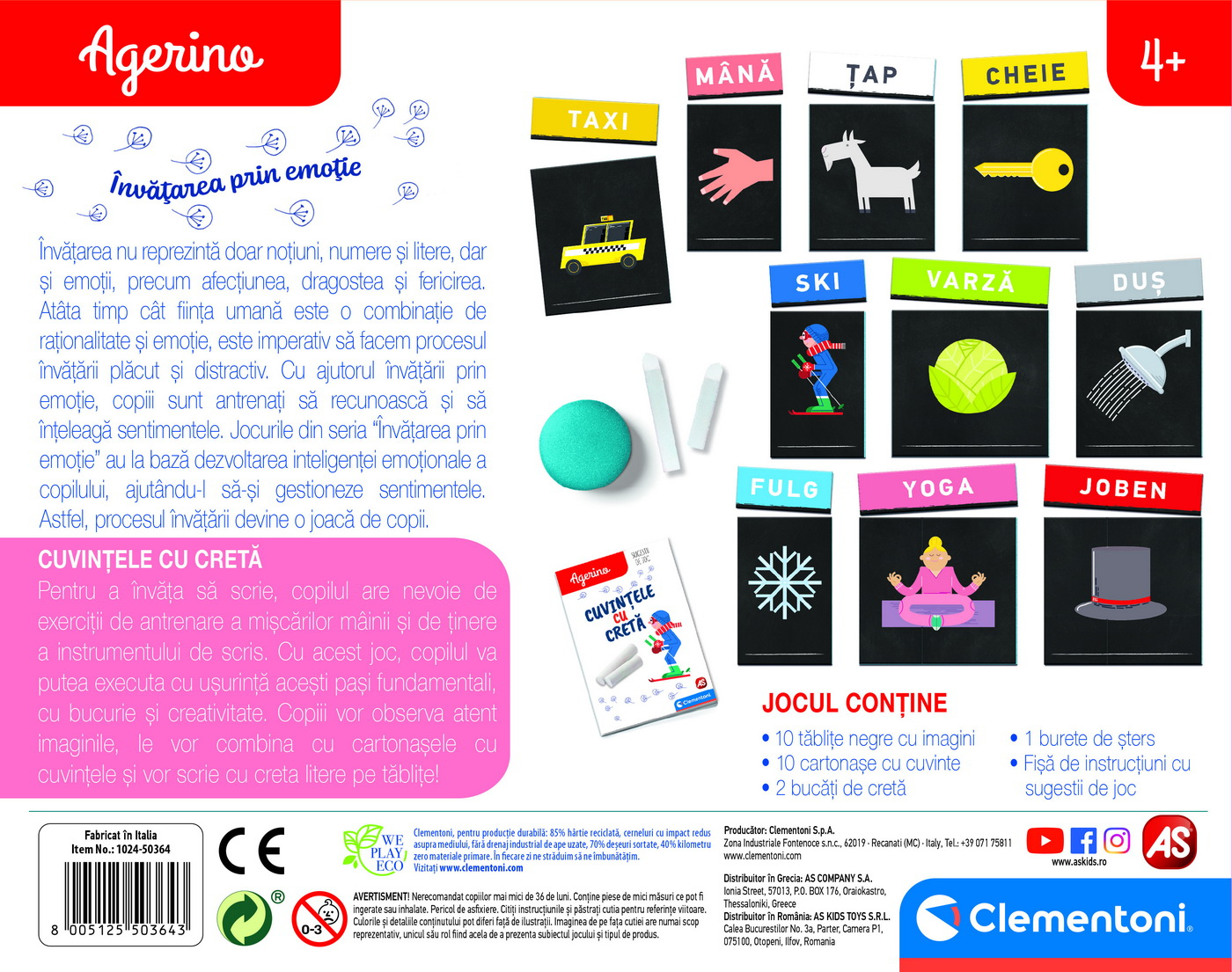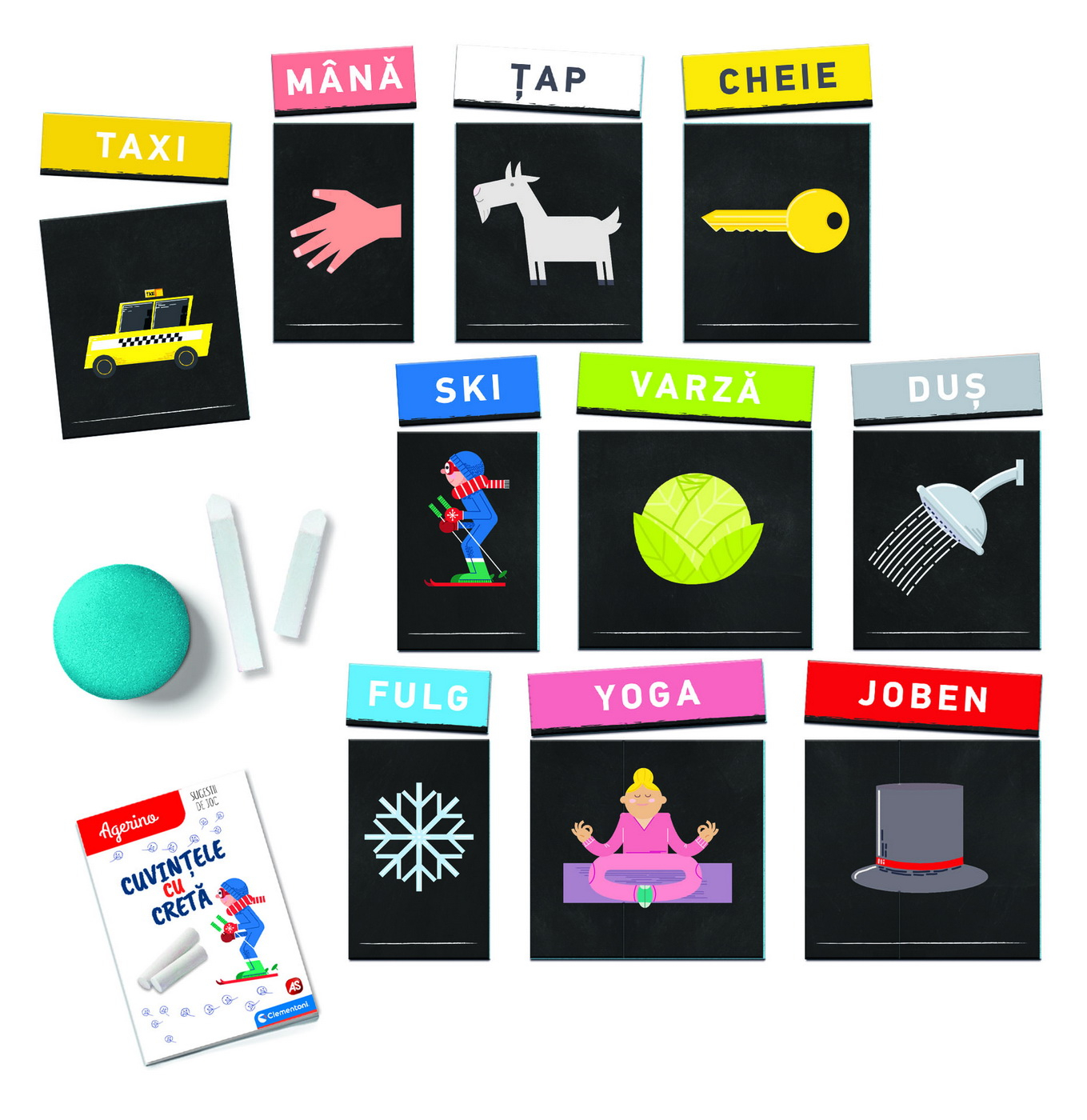 "Cuvintele cu creta" este un joc din seria "Invatarea prin emotie" care are drept scop dezvoltarea inteligentei emotionale la copii. Prin joc, copilul poate executa pasii fundamentali utilizati in procesul de scriere, prin antrenarea miscarilor fine ale mainii si practicarea tinerii instrumentului de scris. Utilizarea cretei ofera posibilitatea de a scrie & sterge de nenumarate ori! Copiii vor observa atent imaginile de pe 10 tablite, vor gasi cuvintele corespunzatoare si vor scrie cuvintele in spatiile rezervate. Valorile dezvoltate: scrisul, citirea, atentia la detalii, inteligenta emotionala, logica, spiritul de observatie. Varsta recomandata 4+.