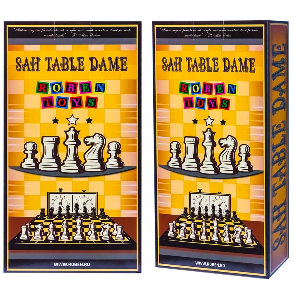 - Setul contine o tabla de joc, 32 piese pentru jocul de sah, 30 piese pentru dame sau table si 2 zaruri.