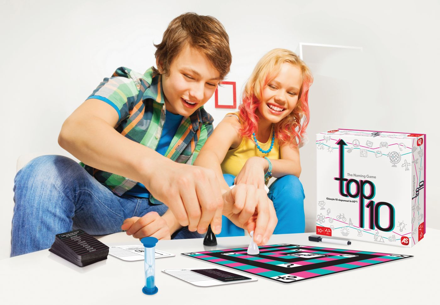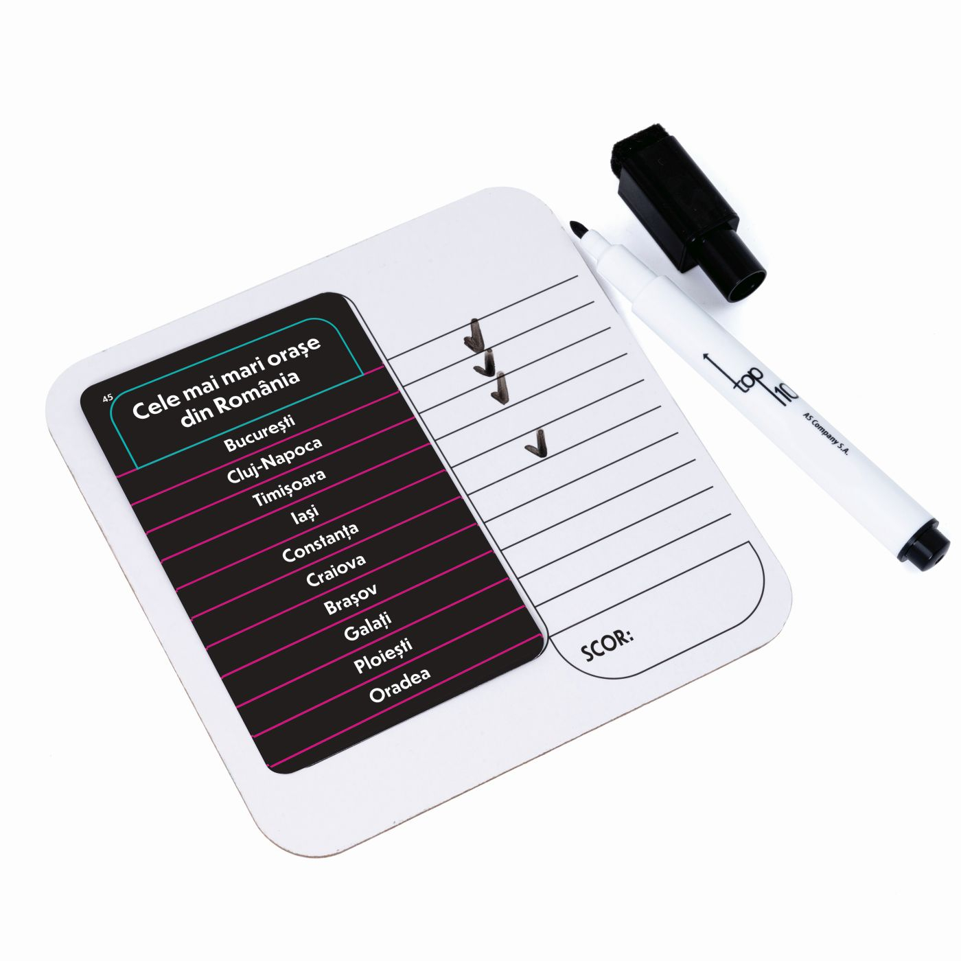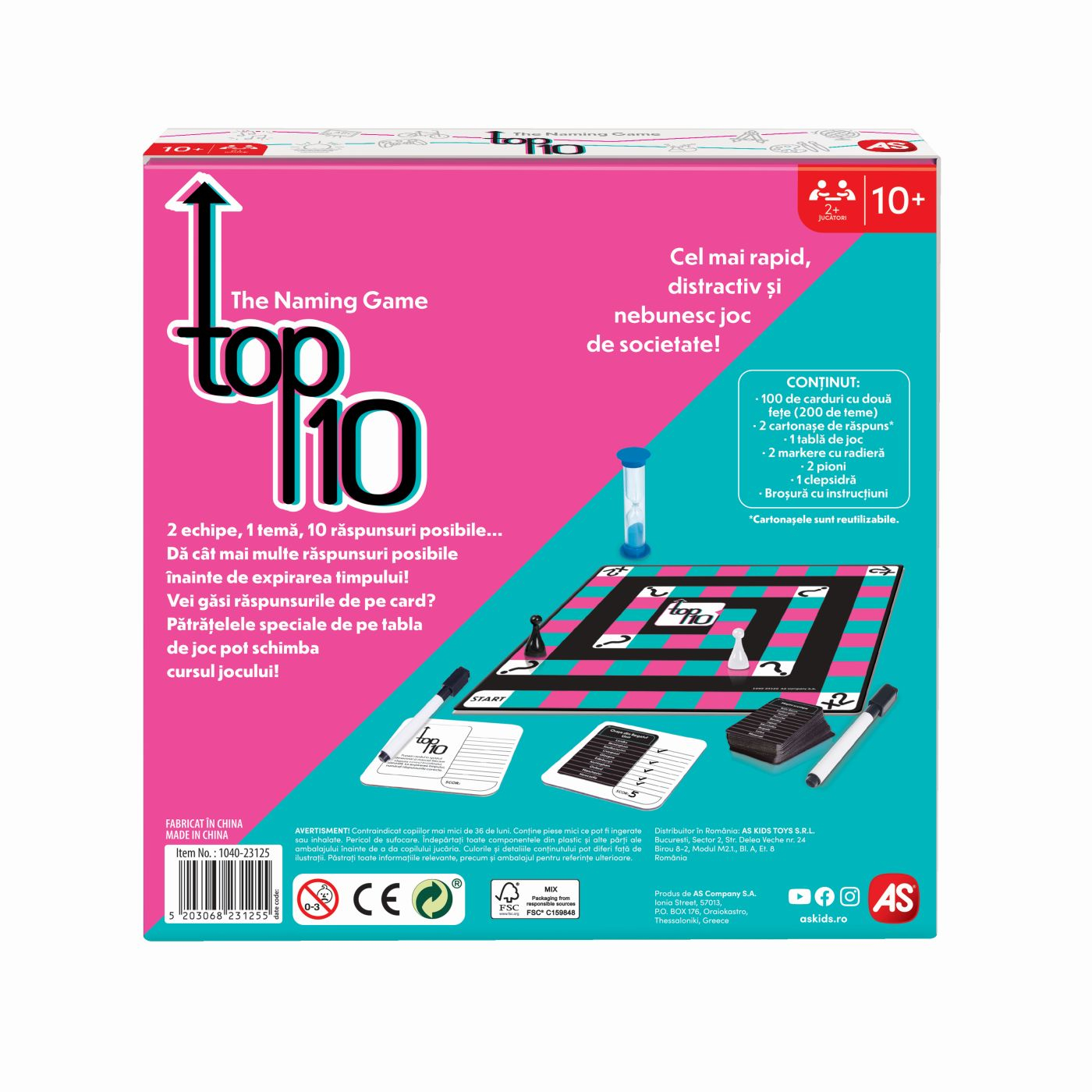 Joc de societate Top 10 in limba Romana. Gaseste 10 raspunsuri in 60 de secunde! Un joc de cultura generala plin de dinamism si distractie, perfect pentru intreaga familie. Fiecare runda te provoaca sa raspunzi rapid si corect la cat mai multe teme, testandu-ti atentia, gandirea si viteza de reactie. Contine: 100 de carduri cu doua fete (200 de teme), 2 cartonase de raspuns*, 1 tabla de joc, 2 markere cu radiera, 2 pioni, 1 clepsidra. Un joc competitiv si amuzant care stimuleaza memoria si gandirea rapida – cine reuseste sa gaseasca cele 10 raspunsuri inainte ca timpul sa se scurga?