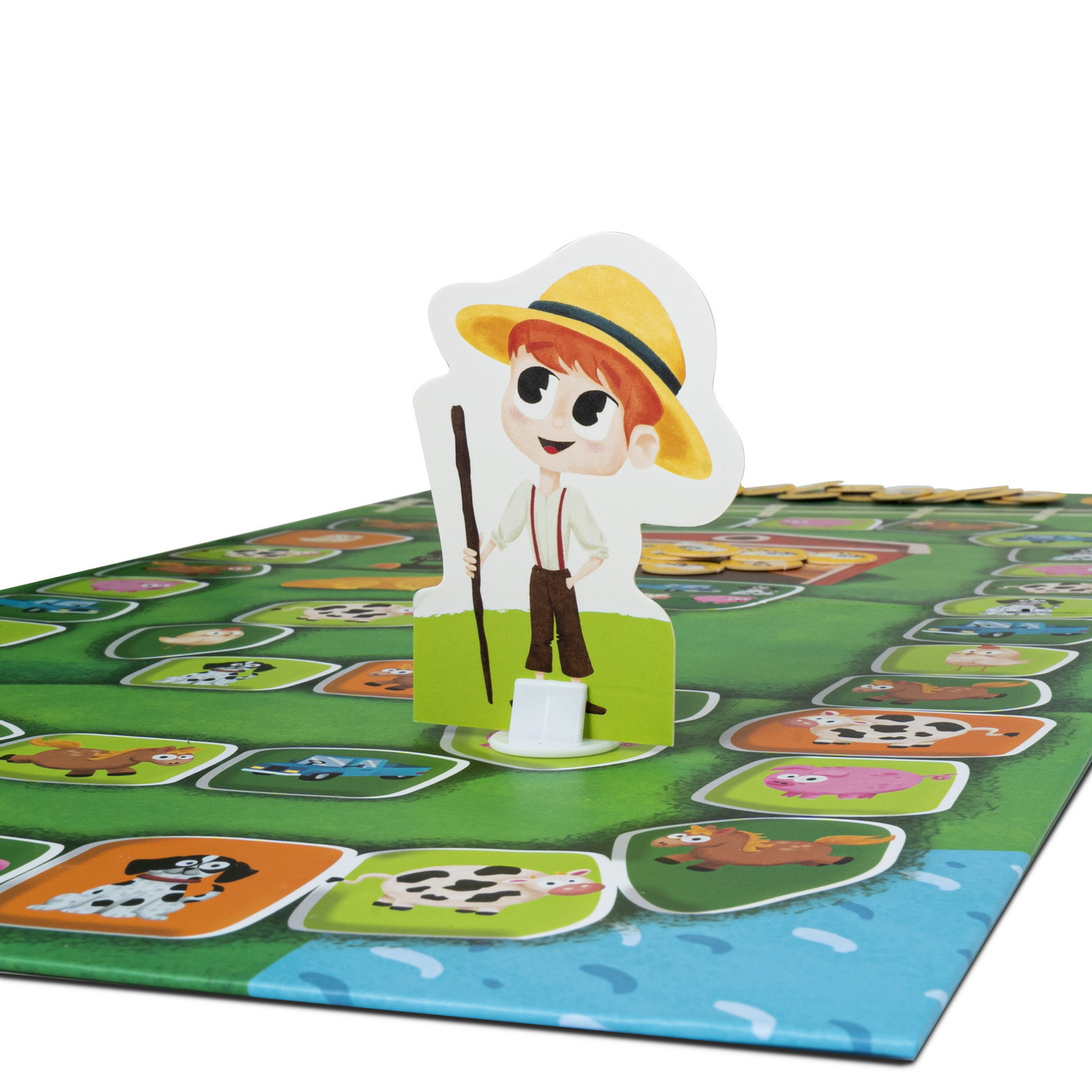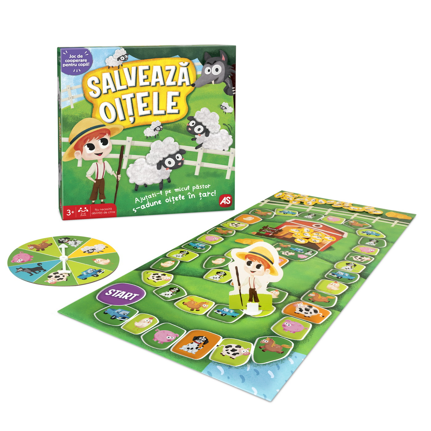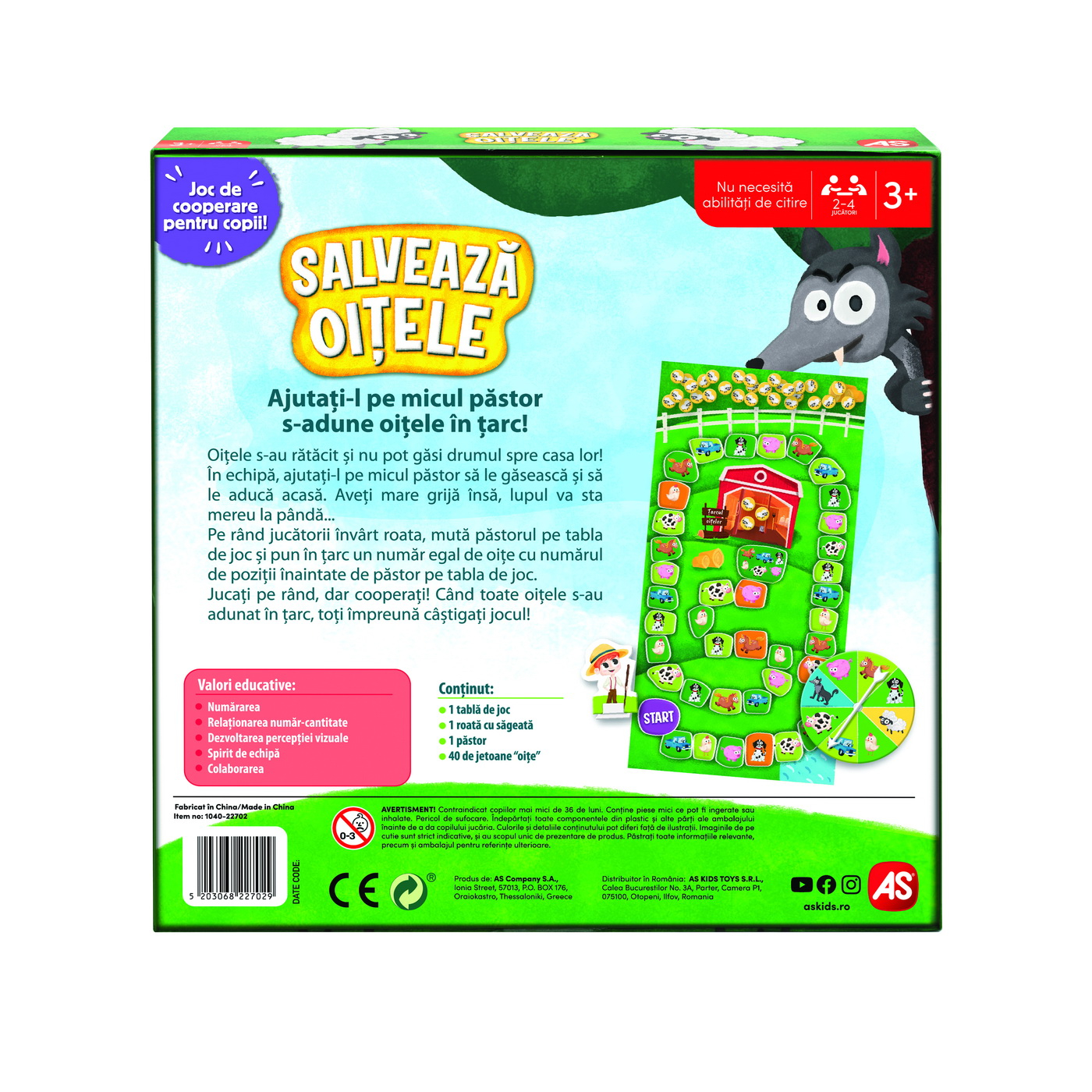 Cine a spus ca toate jocurile vor fi competitive? Salvati oitele este un joc de colaborare, in care toti jucatorii lucreaza impreuna pentru a salva oitele si a le aduce pe toate in siguranta acasa. Rotiti roata si gasiti pe tabla aceeasi imagine ca imaginea indicata de sageata. Numarati pozitiile pe care le-ati avansat pe tabla - acesta este numarul de oi pe care le-ati salvat si pe care le puteti muta in siguranta in casa lor. Dar atentie, daca ciobanasul ajunge acasa si mai sunt oite de salvat, jocul s-a terminat si trebuie sa o iei de la capat! Castigi doar daca toate oitele sunt in casa lor cand ajunge si ciobanasul acasa. Colaborati, lucrati impreuna cu ceilalti si asigurati-va ca salvati toate oitele! Valorile educationale ale jocului: invatarea numerelor si numaratorii, empatie, colaborare, spirit de echipa. Contine: 1 roata si sageata, 1 ciobanas cu baza de plastic, 1 tabla de joc, 40 de jetoane mici „oite”. Varsta recomandata 3+ ani.