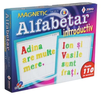 Setul contine tablita magnetica, litere mari si litere mici, inclusiv caractere romanesti, precum si semne de punctuatie. Se pot forma cuvinte si propozitii din Abecedar. Contine peste 160 de piese. Dimensiunea unei litere este de 3 cm.