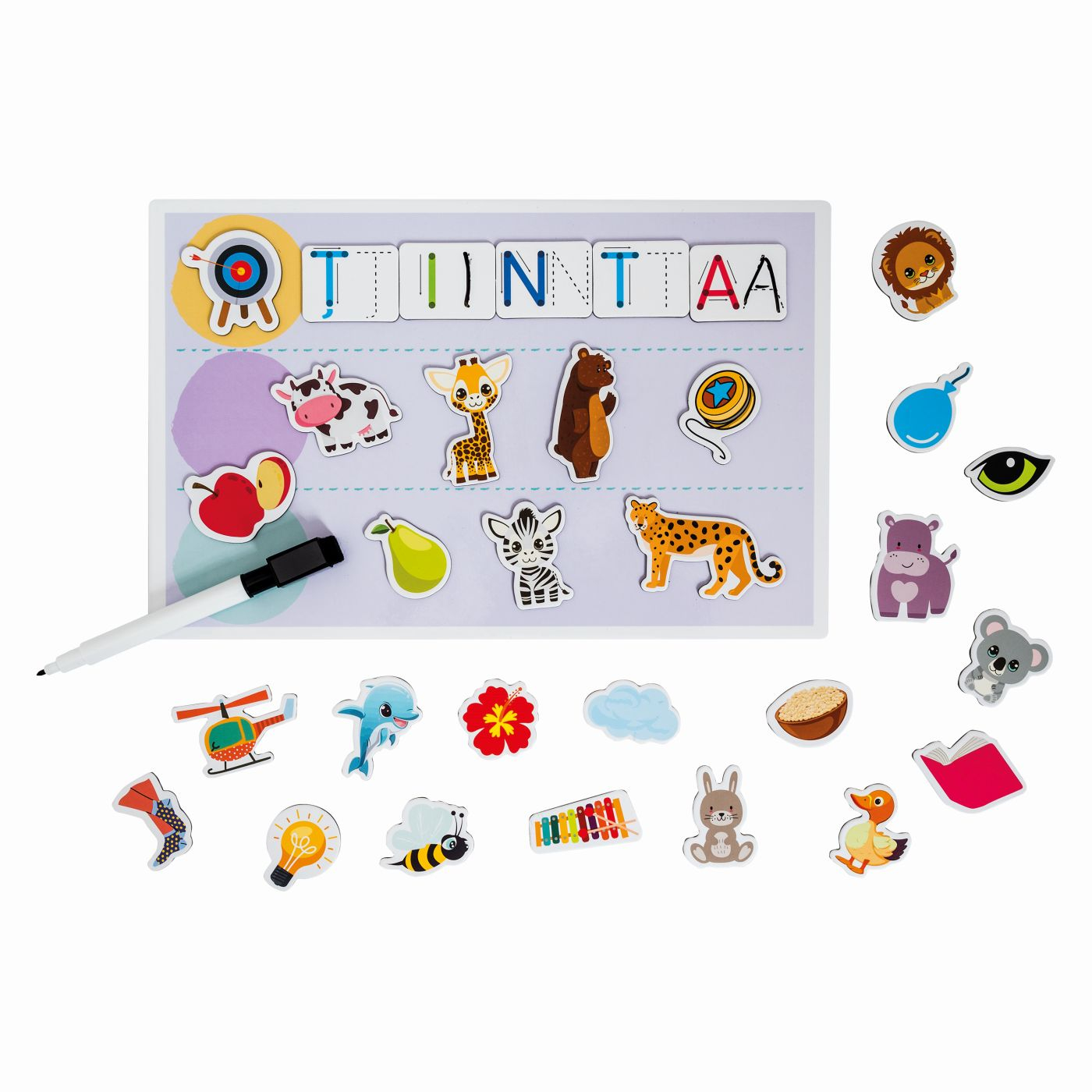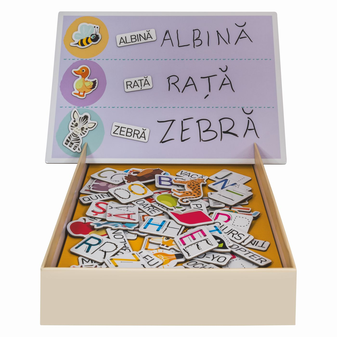 O jucarie educativa progresiv, creat special pentru copiii de la 5 ani, care transforma invatarea literelor intr-o activitate distractiva si interactiva. Plansetele colorate ii incurajeaza pe cei mici sa invete sa citeasca si sa scrie prin exercitii simple si captivante. Pas cu pas, copilul invata sa asocieze obiectele cu literele corespunzatoare, sa exerseze scrierea si sa formeze primele sale cuvinte. Datorita markerului special si buretelui incluse, exercitiile pot fi sterse si reluate de oricate ori doreste copilul, oferindu-i libertatea de a invata in propriul ritm. Un mod jucaus si eficient de a dezvolta vocabularul, atentia si coordonarea mana-ochi!