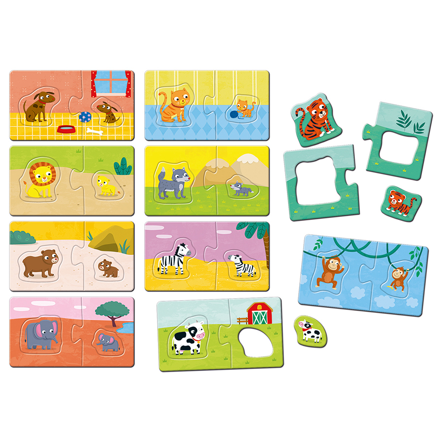 Setul include 20 de piese de puzzle interconectate, realizate din carton rezistent și ilustrate cu animale vesele și ușor de recunoscut. Piesele au margini auto-corective, astfel încât copilul să înțeleagă singur dacă potrivirea este corectă. Jocul contribuie la dezvoltarea gândirii logice, coordonării mână-ochi și abilităților cognitive de bază.