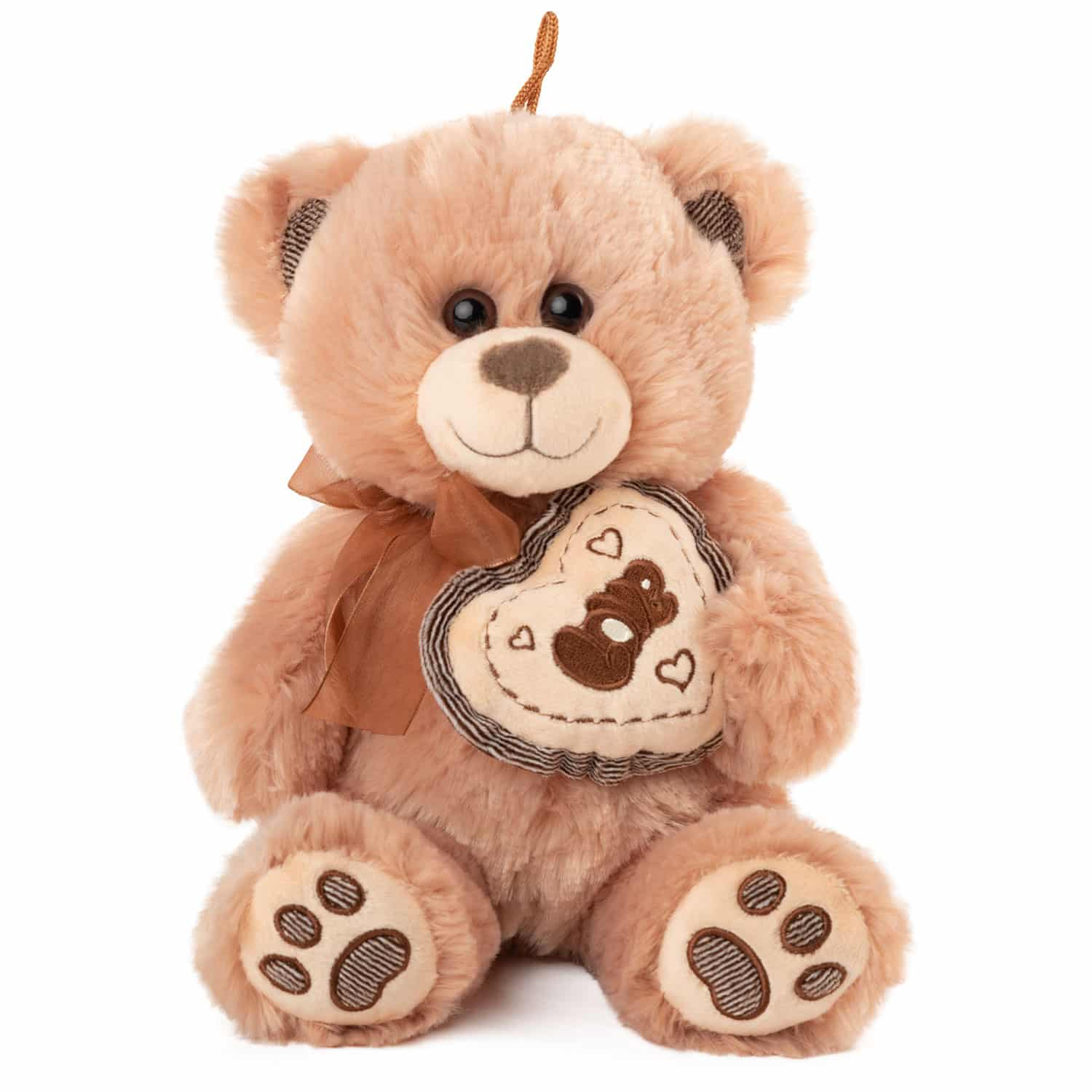 Acest ursuleț de pluș maro, cu o înălțime de 22 cm, este confecționat dintr-un material pufos și catifelat, plăcut la atingere și sigur pentru copii. Ține în brațe o inimioară moale decorată cu un ursuleț brodat și are o fundiță asortată care îi completează perfect aspectul cald și prietenos.