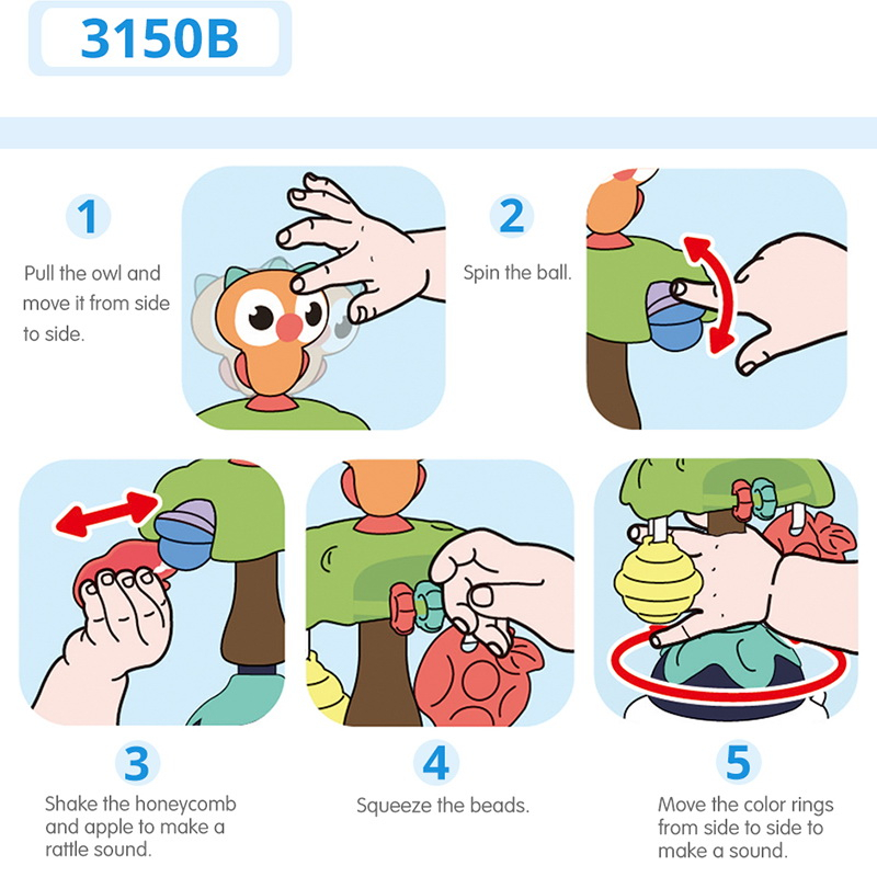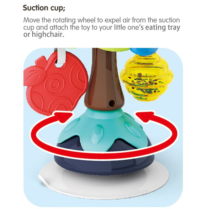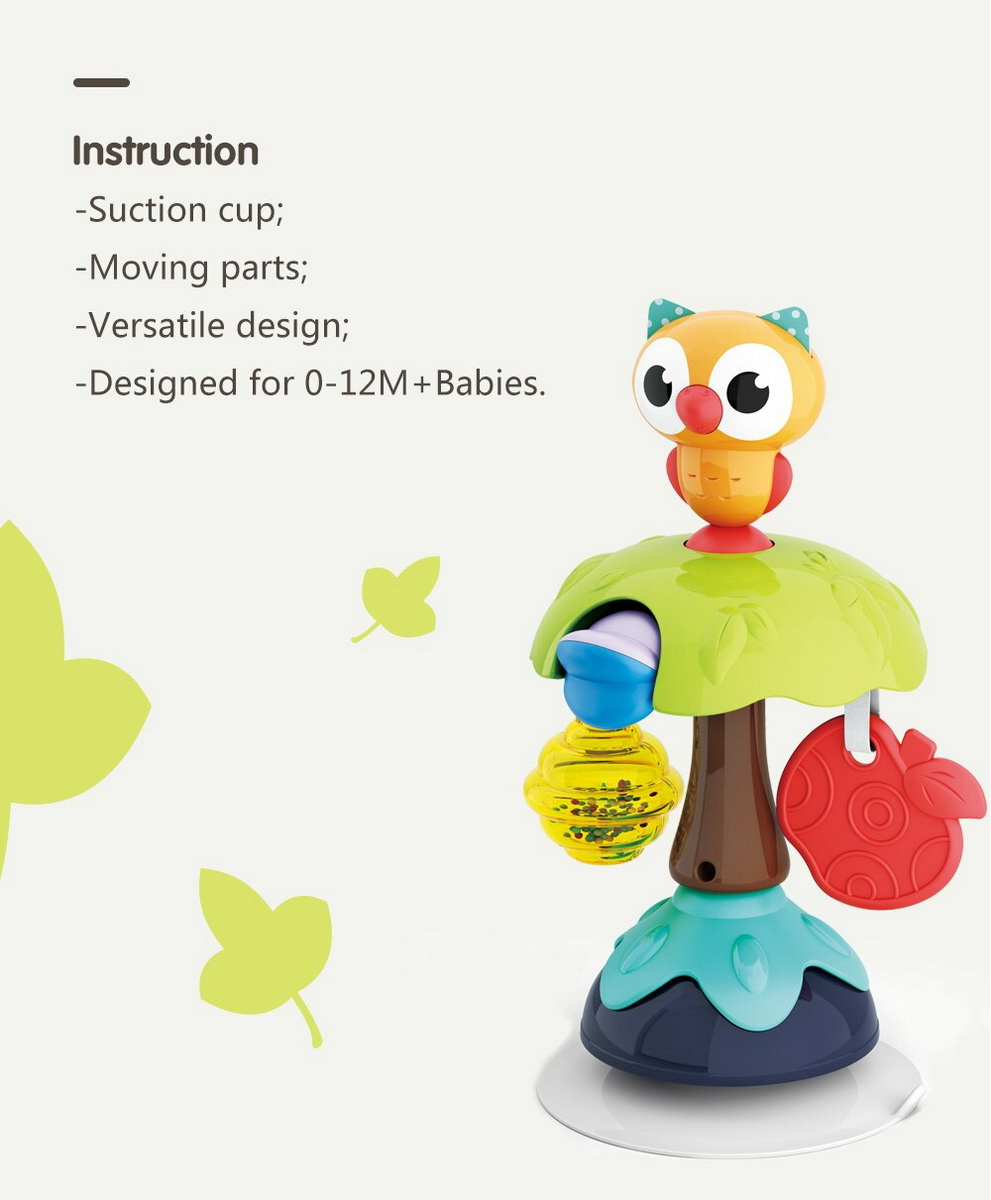 Jucaria bebe Bufnita cu ventuza are parti mobile, texturi variante, culori diferite pentru stimulare vizuala si un design versatil si atragator. Jucaria se poate monta masa copilului, pe scaunul lui de masa, pe parchet sau alte suprafete plane. Jucaria are 5 locuri, in care copilul poate efectua diferite activitatii precum : rotirea, tragerea, apasarea, etc.