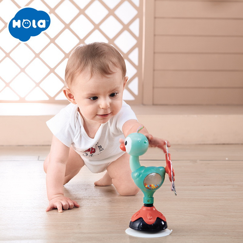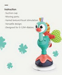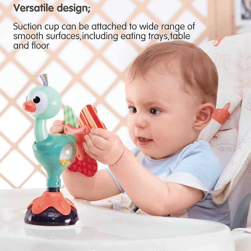 Jucaria Bebe Paun cu ventuza are parti mobile, texturi variante, culori diferite pentru stimulare vizuala si un design versatil si atragator. Jucaria se poate monta masa copilului, pe scaunul lui de masa, pe parchet sau alte suprafete plane. Jucaria are 5 locuri, in care copilul poate efectua diferite activitatii precum : rotirea, tragerea, apasarea, etc.