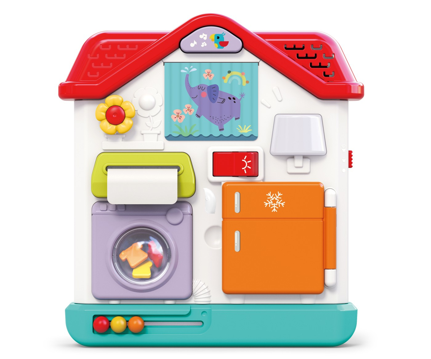 Casuta de jucarie cu activitati senzoriale Montessori. Jucariile Montessori sunt concepute pentru a incuraja invatarea prin joc si pentru a stimula abilitatile de manipulare, observatia si imaginatia copilului. Aceste abilitati sunt importante pentru invatarea practica si dezvoltarea copiilor. Apasati butonul de muzica pentru a asculta cele 8 melodii. Efecte sonore amuzante vor fi adaugate melodiilor atunci cand apasati pe masina de spalat, sticla de lapte sau cutia de servetele.