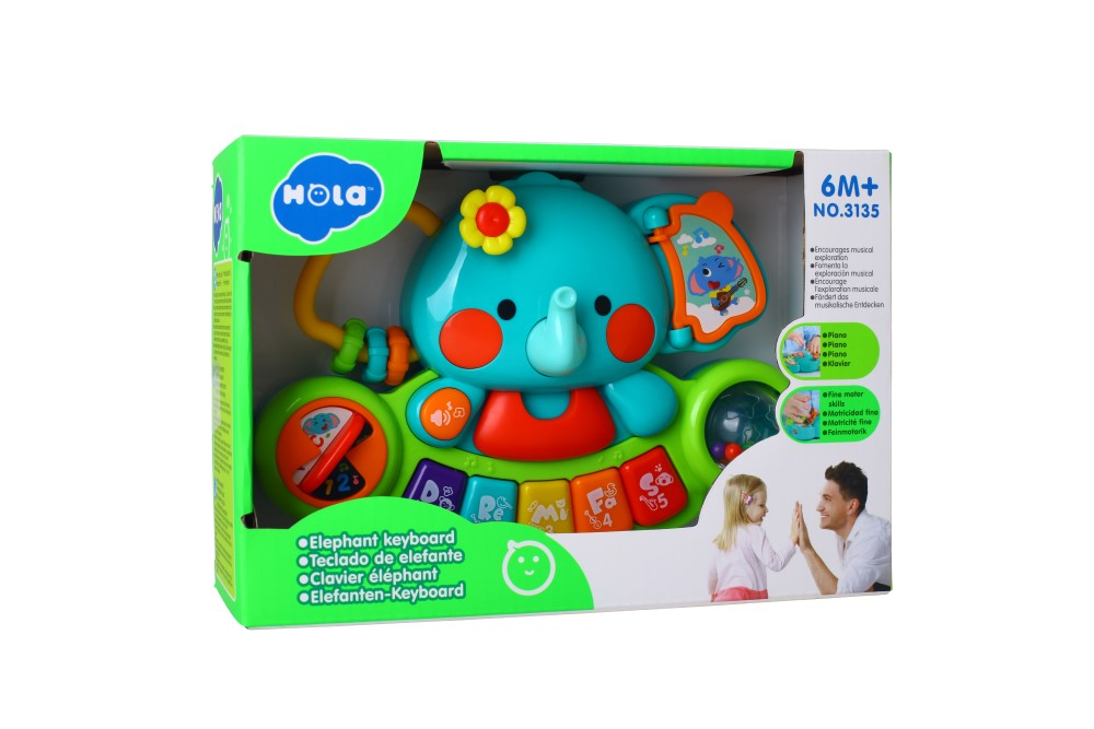 Jucarie muzicala sub forma unui elefant cu cinci taste de pian. Exista, de asemenea, inele, o mini-carte cu poze, bile, rasucire, becuri, buton de volum. Cand apasati tastele, melodiile, sunetele amuzante si sunetele animalelor sunt redate, iar luminile se aprind. Un elefant muzical este potrivit pentru bebelusii de la 6 luni sa se joace, sa dezvolte abilitati motrice fine si perceptia auditiva. Jucaria respecta standardele de calitate si siguranta: EN71 (european).