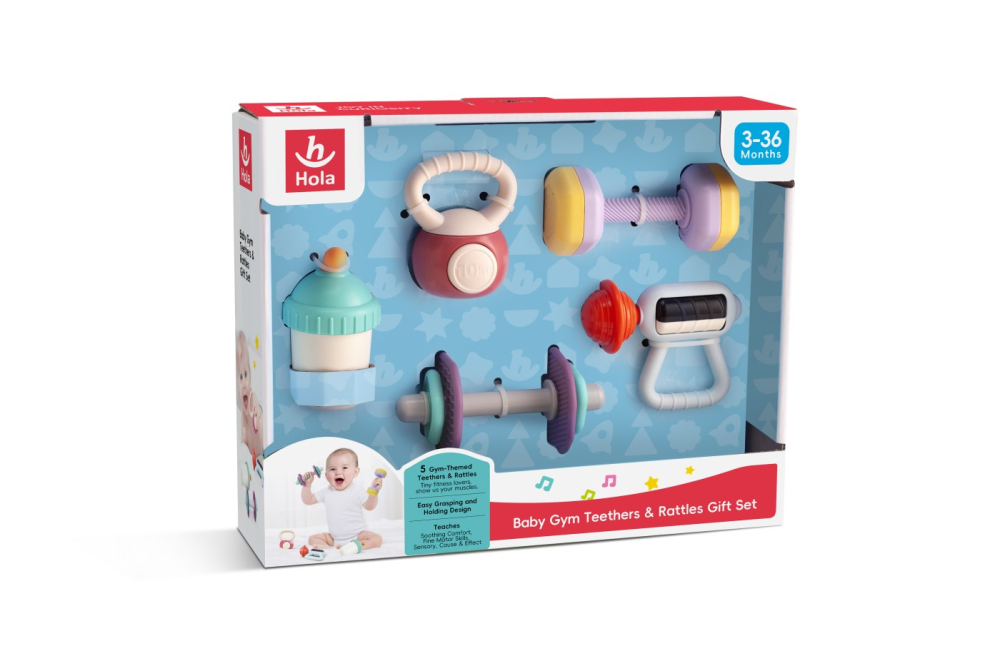 Setul de cadou Hola Baby Gym Teether and Hounds este o optiune de cadou adorabila si distractiva pentru cei mici. Dispune de un design jucaus, cu tematica de sala de sport, care include dispozitive de dentitie si zornaitoare in forma de gantere, pistol de masaj, pahar cu apa si greutati. Aceasta colectie este perfecta pentru mainile mici. Acest adorabil set de zornaituri stimuleaza abilitatile motorii fine, descoperirea senzoriala si ii ajuta pe copii sa inteleaga cauza si efectul.