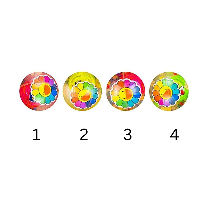 - Mingea este realizata la exterior din cauciuc transparent, iar in interior plutesc in lichid un desen cu floarea-soarelui cu petale colorate, 1 bila cu led si mici confetti stelute colorate. Bila cu led are lumini colorate, intermitente si un desen dragut cu animale.