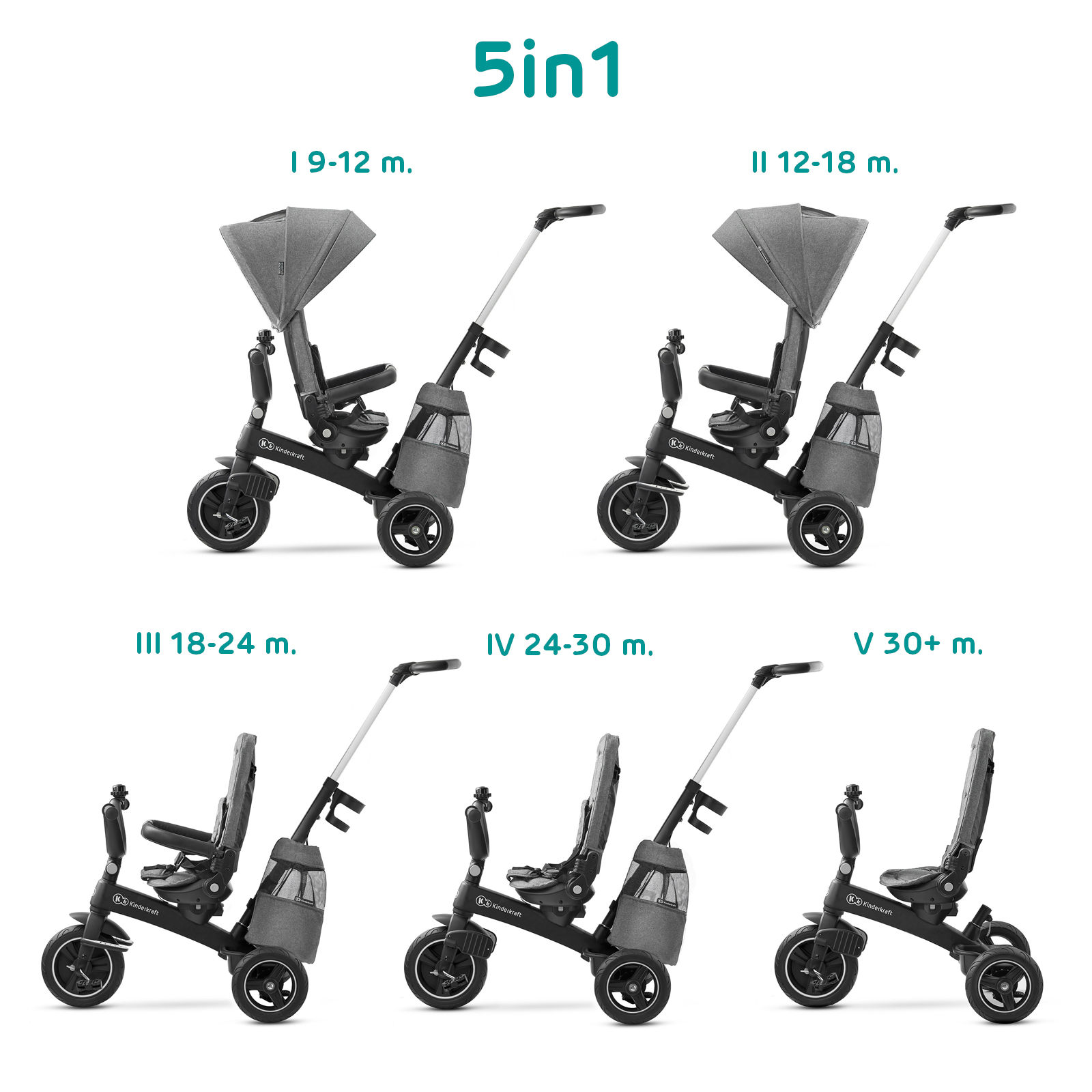 Tricicleta Kinderkraft EASYTWIST, PLATINUM GREY Plimbarea este pentru un copil o ocazie excelenta de a descoperi lumea din jur. EASYTWIST PLATINUM GREY este o tricicleta de care se va indragosti fiecare copil ! În timp ce ii asigura copilului o buna distractie, il ajuta sa-si dezvolte abilitatile motorii – deja de la varsta de 9 luni! sezutul inovator, dotat cu sistemul pivotant CLICK & TWIST, permite o rotatie completa la 360°, iar bicicleta in sine este usoara si extrem de durabila - datorita unui cadru solid din aliaj de magneziu. Plimbarea cu aceasta tricicleta ajuta, de asemenea, la stapanirea echilibrului, sustine coordonarea motorie si invata un comportament corect si sigur in afara casei. EASYTWIST PLATINUM GREY este o tricicleta 5 in 1 - datorita constructiei sale modulare poate fi modificata si ajustata la varsta si inaltimea copilului. Avantaje Siguranta: Rotile tricicletei sunt fabricate din PU - sunt puternice si durabile - practic impenetrabile. Au o rezistenta crescuta la abraziune. Rotile din spate sunt, de asemenea, echipate cu rulmenti, si de aceea sunt perfecte pentru orice suprafata. Confortabil de utilizat, bara fixata protejeaza copilul impotriva caderii. Element protector al rotii din fata pentru a proteja picioarele copilului in timpul mersului. Centuri de siguranta in 5 puncte cu elemente protectoare moi (pentru centura dintre picioare). Blocaj care permite pedalarea fara propulsarea rotii. Îndeplineste standardul european EN-71. Franele (cate una pe fiecare roata) impiedica deplasarea accidentala a tricicletei. Confort: Copertina rabatabila care protejeaza copilul de soare si vant (impermeabila, cu UPF 50+). Maner reglabil pentru parinte (de la 84 cm la 107 cm). Manerul poate fi setat pe 4 niveluri. Manevrarea usoara a tricicletei in timpul mersului cu ajutorul manerul dedicat pentru parinte. Manerele antiderapante din cauciuc asigura o prindere sigura pentru copil. Husa detasabila a scaunului poate fi spalata in masina de spalat rufe. Functionalitate: Scaun CLICK & TWIST rotativ la 360°. Tricicleta creste odata cu copilul - structura modulara face posibila modificarea produsului pentru a-l potrivi la varsta micului utilizator (5 optiuni de setare!). La tricicleta sunt atasate accesorii suplimentare, cum ar fi un cos pentru maruntisurile copilului, un sac-rucsac si un suport pentru o cana sau o sticla de apa. Usurinta cu care se poate face demontarea anumitor elemente, face ca EASY TWIST PLATINUM GREY sa fie foarte usor de transportat. Accesorii suplimentare Sac-rucsac Cos pentru maruntisuri Suport pentru cana Sonerie Fabricatie Materiale: Cadru: fabricat din aliaj ultra-usor si durabil de magneziu Material: poliester nealergen, cu uscare rapida, rezistent la abraziuni si conditii meteorologice Roti: PU Dimensiuni: • inaltime (maner parinte): 107 cm • inaltime (bicicleta cu copertina): 130 cm • latime (roata din fata): 34 cm • inaltime (roata din fata): 25,4 cm • inaltime (roata din spate): 20,3 cm Greutate: 10 kg Dimensiuni ambalaj/ greutate: 73 x 43 x 28,5 cm/11,8 kg