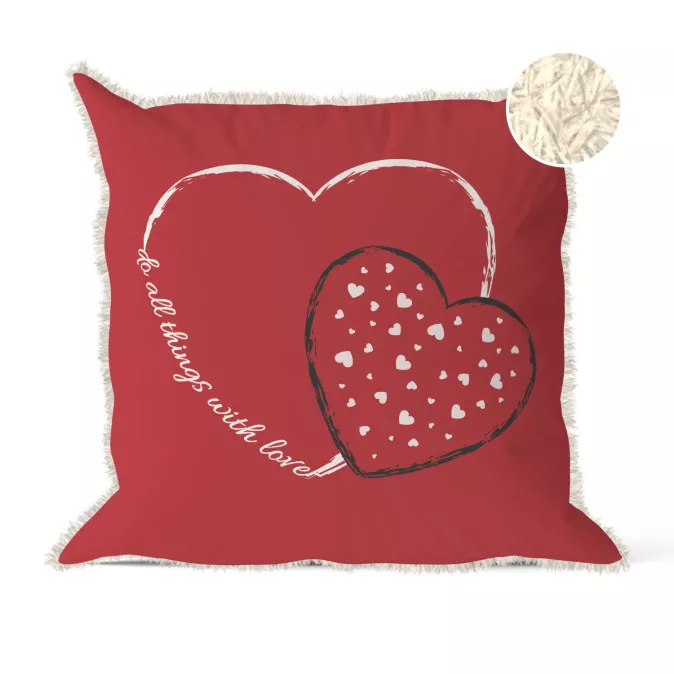 Oferă în dar sinceritate și căldură cu perna decorativă „Totul cu dragoste”, un accesoriu plin de emoție, creat special pentru a transmite iubire. Cu un design curat și elegant, în roșu intens, decorat cu inimioare delicate și mesajul „Fă toate lucrurile cu dragoste”, această alegere este ideală pentru Ziua Îndrăgostiților sau pentru orice moment în care vrei să îți exprimi afecțiunea față de cineva drag.