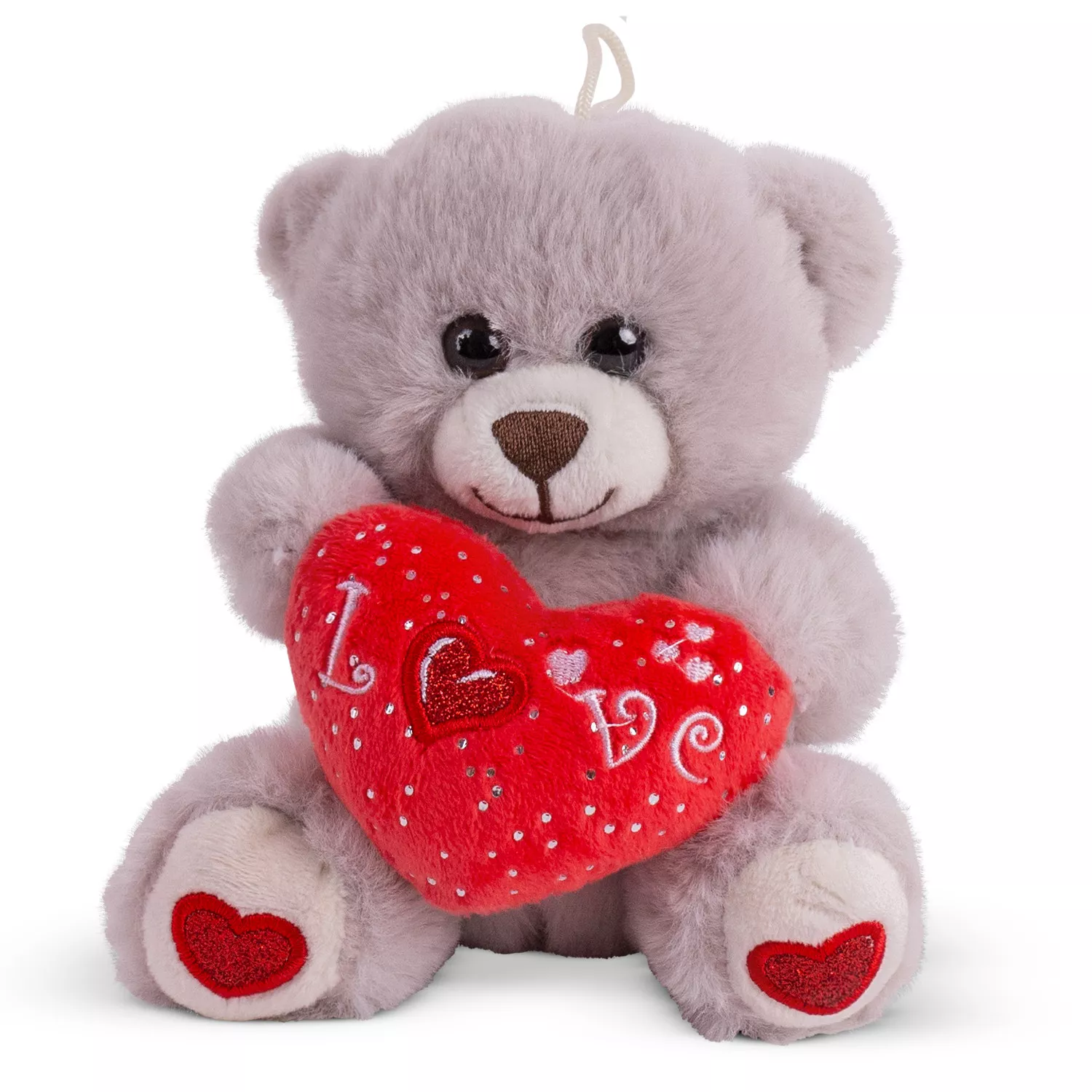 Ursulețul ține în mână o inimă roșie decorativă, care adaugă un accent romantic și îl transformă într-un simbol al iubirii și al atenției. Lăbuțele sunt decorate cu mici inimioare, completând armonios aspectul său delicat.