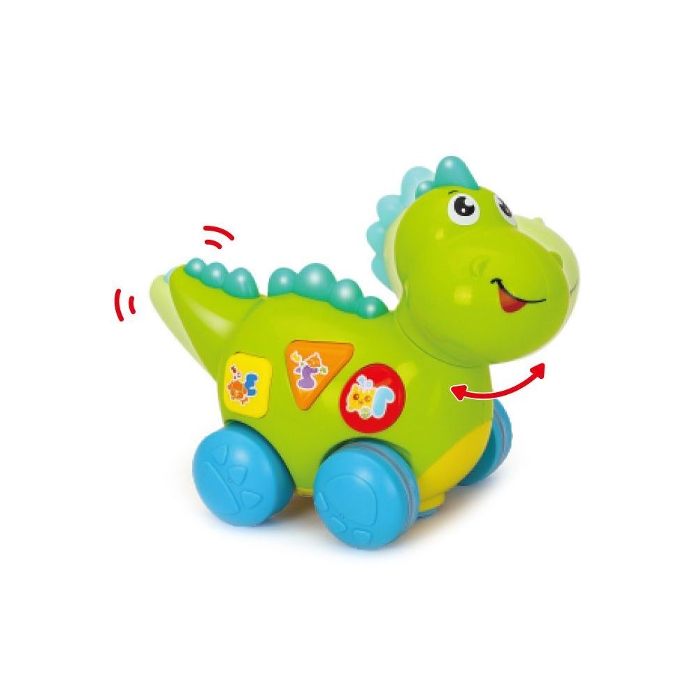 Micul dinozaur cu lumini si sunete va oferi copilului dumneavoastra momente pline de distractie si veselie, iar dumneavoastra, privindu-l, zambete. Apasa pe butoane, urmareste culorile, asculta sunetele, aceste simple dar extrem de importante activitati sunt benefice pentru dezvoltarea inteligentei si atrag, dupa sine, curiozitatea copilului in timpul jocului. Luminile emise de catre aceasta ii starnesc curiozitatea, descoperind noi moduri de a se juca. Dezvolta perceptia vizuala si coordonarea dintre maini si ochi. Dinozaurul are buton Oprit / Pornit, efecte luminoase, butoane interactive si miscari ale corpului. Cand acesta porneste la plimbare, acesta va misca din cap si din codita. Formele speciale si culorile vii incurajeaza copilul sa exerseze si sa se joace stimuland astfel dezvoltarea individuala. Melodiile/frazele/suntele redate de jucarie sunt in limba engleza.
