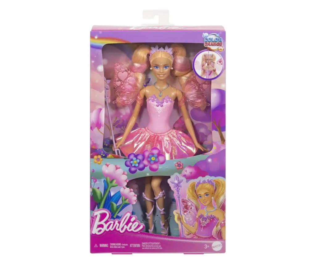Transformarea este reversibilă, astfel că magia poate fi repetată ori de câte ori dorința de joacă reapare. Apa caldă readuce culorile inițiale, oferind posibilități nelimitate de explorare și distracție. Barbie poartă o rochie strălucitoare, pantofi cu model de viță de vie, o bentiță cu fluturi și un colier delicat, completând aspectul de zână modernă și elegantă.