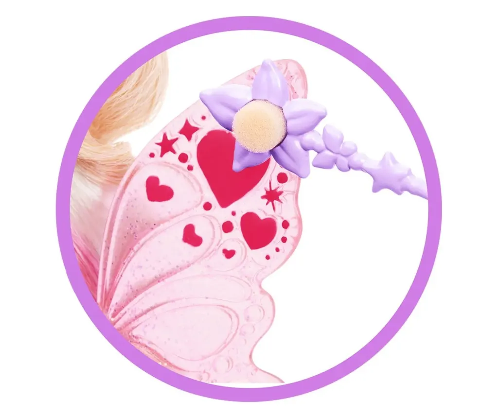 Păpușa Barbie Color Change Zână magică invită copiii într-o lume plină de culoare și fantezie, unde magia prinde viață prin joc. Folosind buretele de pe bagheta înstelată și apă rece, inimioarele de pe aripioarele zânei își schimbă culoarea din roz delicat în roșu strălucitor, iar corsajul dezvăluie un efect ombre încântător.