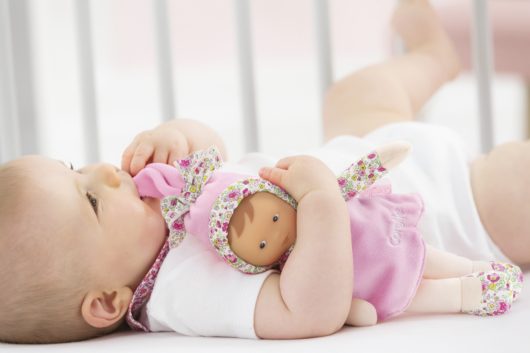 Papusa cu corp moale este perfecta pentru cei foarte mici. Are dimensiunea perfecta , 25 cm, pentru ca mainile mici sa o apuce si sa o tina de sapca, palarie, brate, picioare, chiar si rochia ei si este confectionata dintr-o tesatura ultra-moale care o face foarte dragalasa. Fata ei dulce si realista de vinil farmeca si mangaie copilul si este delicat parfumat cu vanilie. Un plus pentru parinti: papusa moale Miss Pink Blossom are o eticheta cusuta pentru a scrie prenumele bebelusului sau un numar de telefon in cazul in care papusa este pierduta.