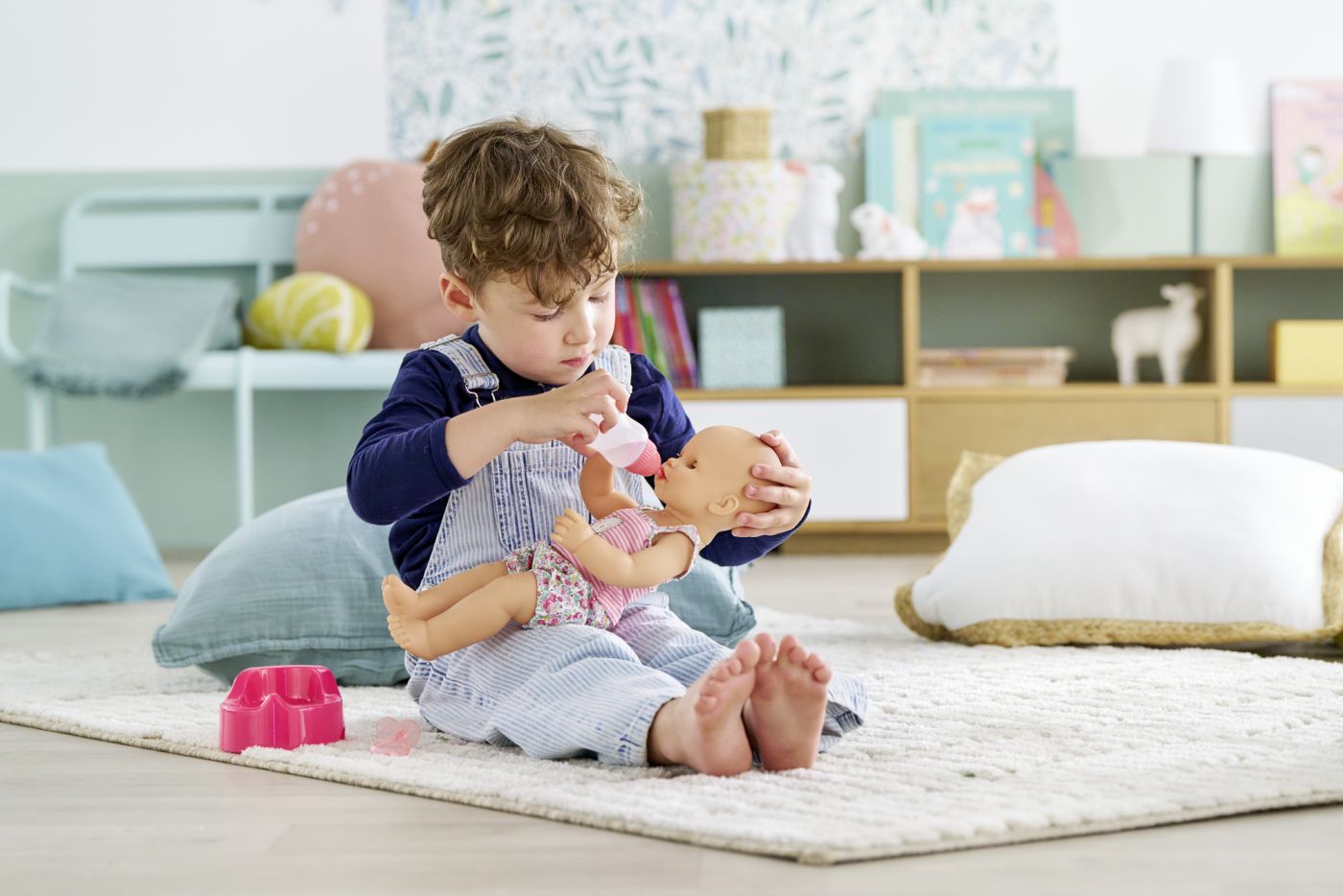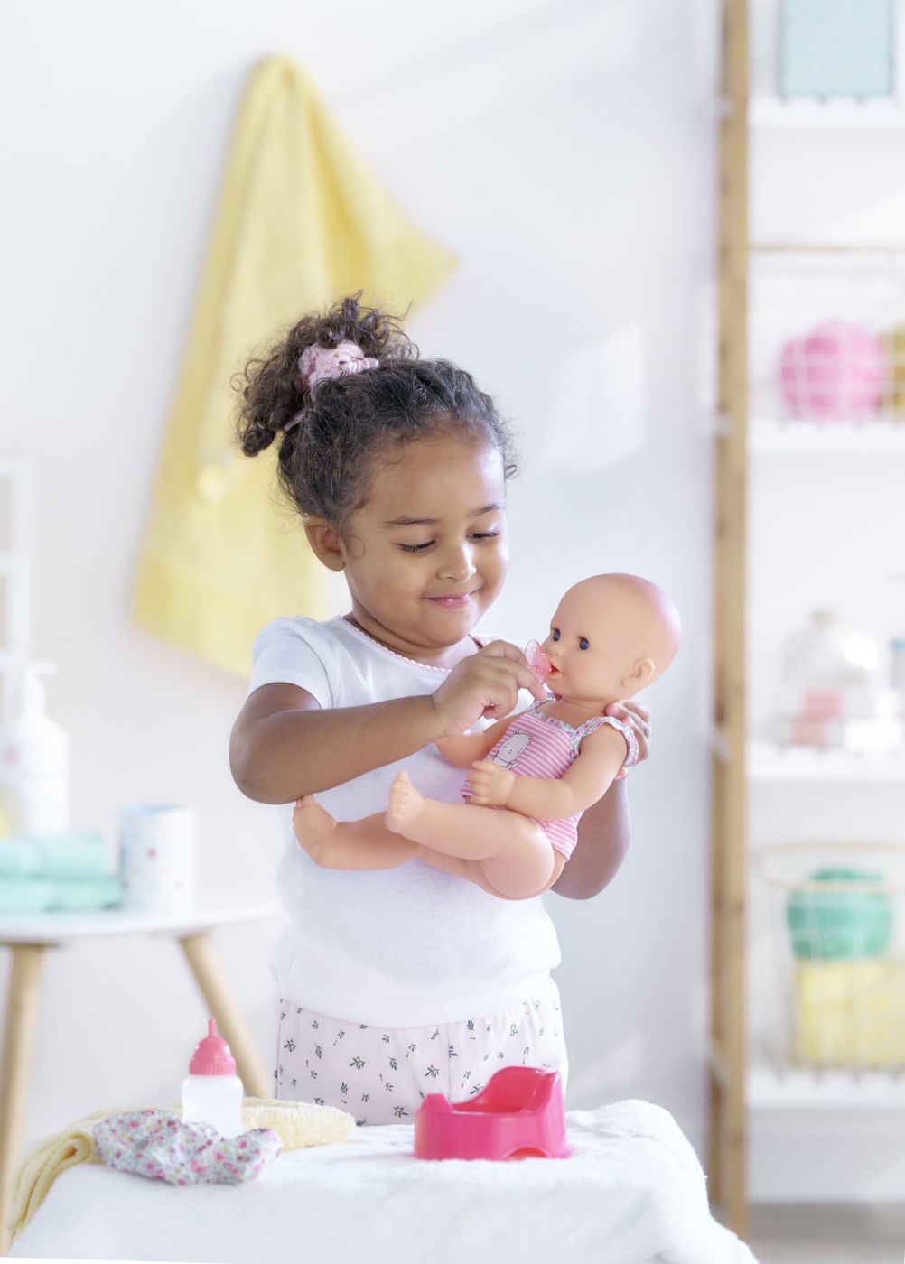 Emma este o papusa mare Corolle pentru joaca si comportament ca adultii. Cu olita ei, biberonul de umplut si suzeta, este companionul perfect pentru antrenamentul la olita! Datorita corpului ei, delicat parfumat cu vanilie si fabricat in intregime din vinil moale la atingere, poate intra in apa in timp ce sta in sezut. Masoara 36 cm, o dimensiune perfect potrivita pentru bratele mici ale unui copil pentru a fi alintat, a fi mama si a imita actiunile care definesc cresterea unui copil. Cu ochii ei somnorosi, adoarme cand sta intinsa pe spate. Este imbracata in pantaloni scurti frumosi cu imprimeu floral si un maiou. Degetul mare poate fi tinut in gura. Emma are o colectie completa de haine si accesorii Corolle Mon Grand Poupon pentru a imita gesturile de zi cu zi si a inventa scenarii de joaca multiple si variate. Nu poate purta ghete. De la 2 ani.