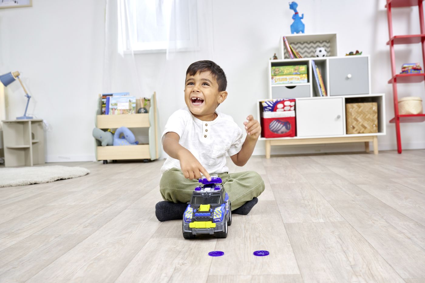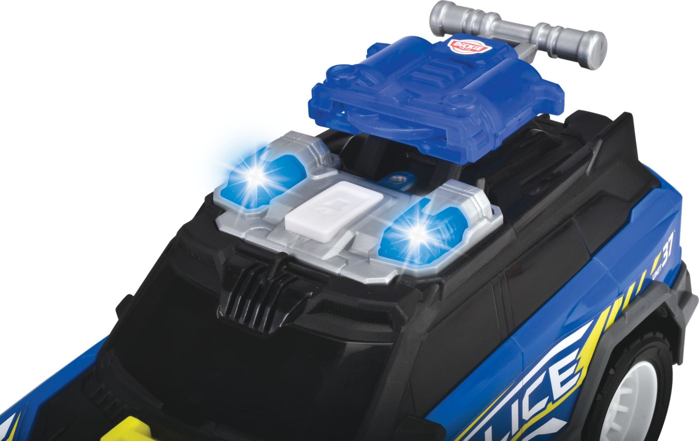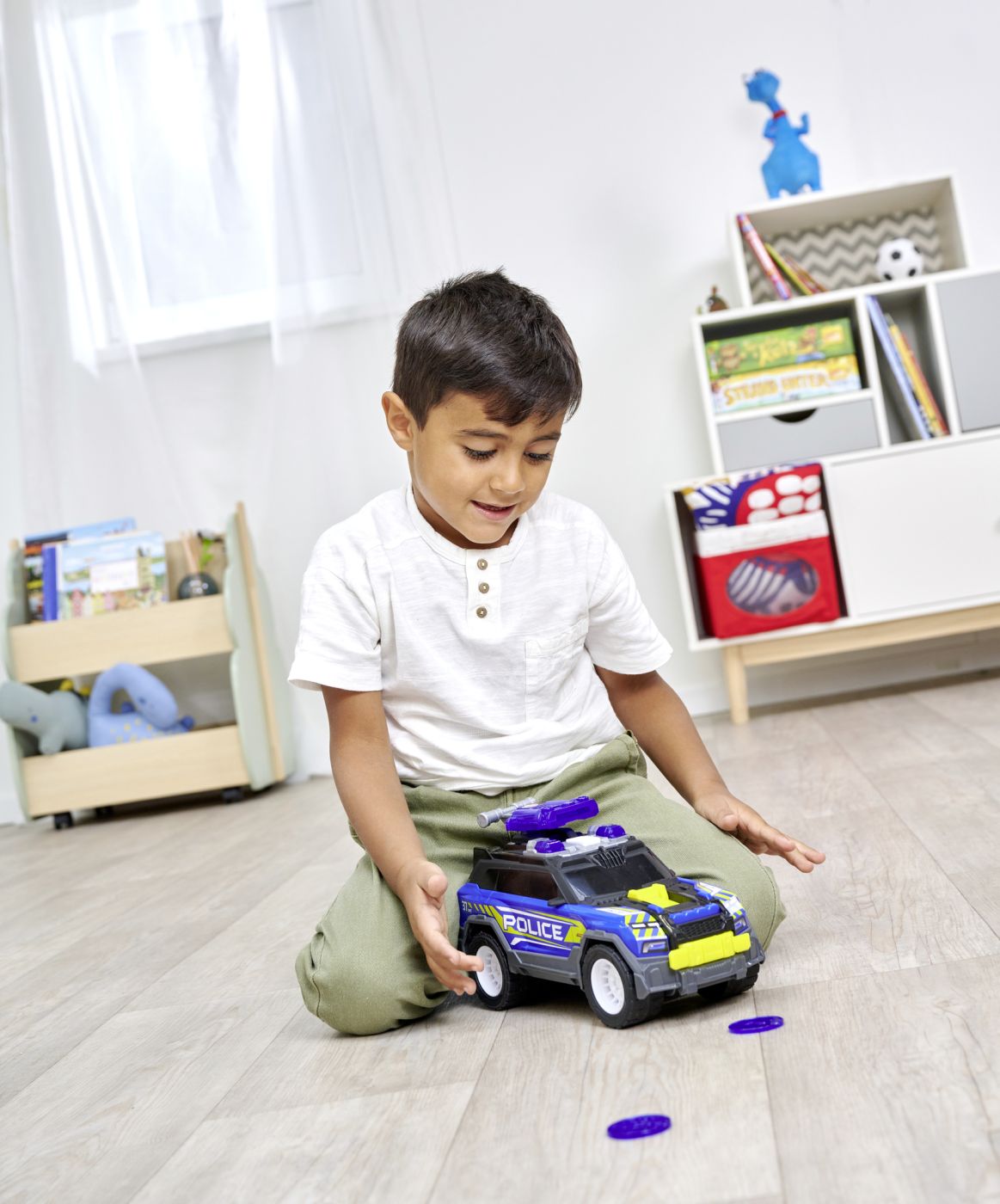 Niciun escroc nu este in siguranta de aceasta masina de jucarie: cu functiile sale interactive si extra surprinzatoare, masina de politie de 30 cm lungime va dobori orice criminal. Echipat ideal pentru fiecare desfasurare: tragatorul de discuri de pe acoperis trage cele 2 discuri incluse, care sunt proiectate cu motive de drona si apa. Sirena si luminile albastre sunt, desigur, o necesitate pentru fiecare masina de politie, completate de zgomote realiste de pornire a motorului si de conducere!