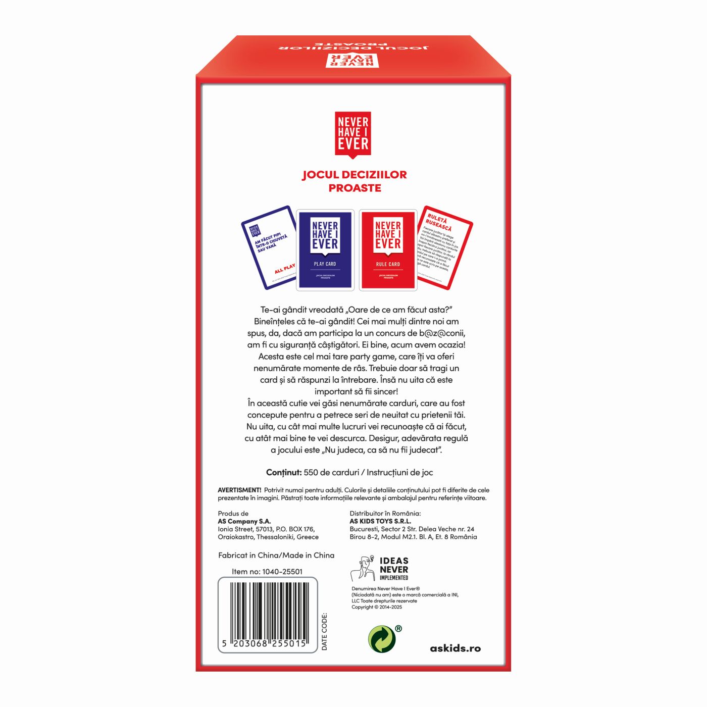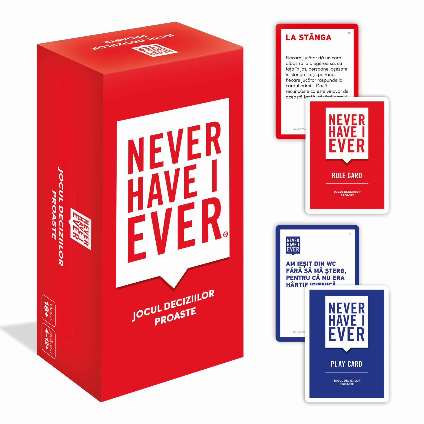 Jocul deciziilor proaste este jocul ideal pentru serile intre adulti care nu se tem sa recunoasca aventurile, greselile si momentele amuzante din trecut! Simplu, sincer si plin de rasete, acest joc te provoaca sa spui adevarul despre cele mai nebunesti experiente pe care le-ai trait (sau nu). Fiecare runda dezvaluie povesti neasteptate si reactii memorabile, transformand orice seara intr-o experienta de neuitat. Perfect pentru petreceri sau seri intre prieteni, Never Have I Ever este jocul in care sinceritatea si umorul se intalnesc intr-o combinatie exploziva. Continut strict pentru adulti – 18+. Jocul deciziilor proaste... pe care toata lumea le-a luat cel putin o data!
