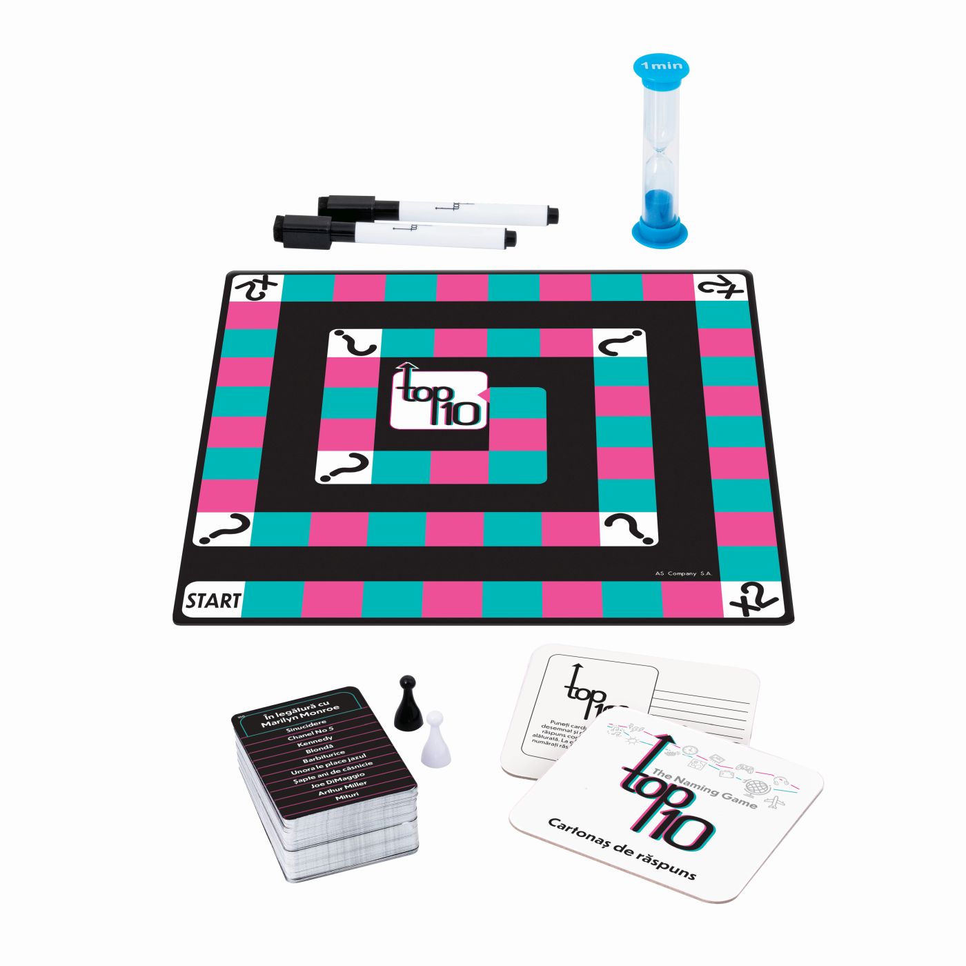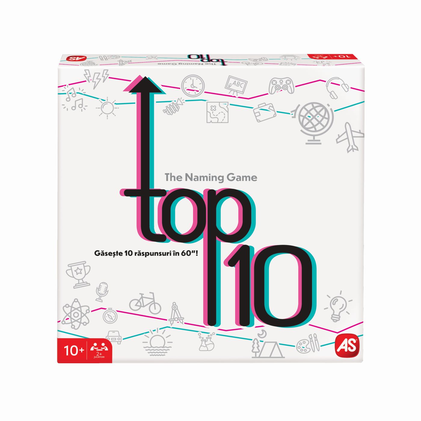 Joc de societate Top 10 in limba Romana. Gaseste 10 raspunsuri in 60 de secunde! Un joc de cultura generala plin de dinamism si distractie, perfect pentru intreaga familie. Fiecare runda te provoaca sa raspunzi rapid si corect la cat mai multe teme, testandu-ti atentia, gandirea si viteza de reactie. Contine: 100 de carduri cu doua fete (200 de teme), 2 cartonase de raspuns*, 1 tabla de joc, 2 markere cu radiera, 2 pioni, 1 clepsidra. Un joc competitiv si amuzant care stimuleaza memoria si gandirea rapida – cine reuseste sa gaseasca cele 10 raspunsuri inainte ca timpul sa se scurga?