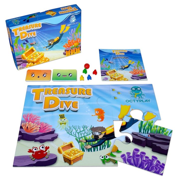 Treasure Dive este un joc de societate pentru 2, 3 sau 4 jucatori in care parcurgi un traseu numerotat pentru a ajunge la comoara scufundata.