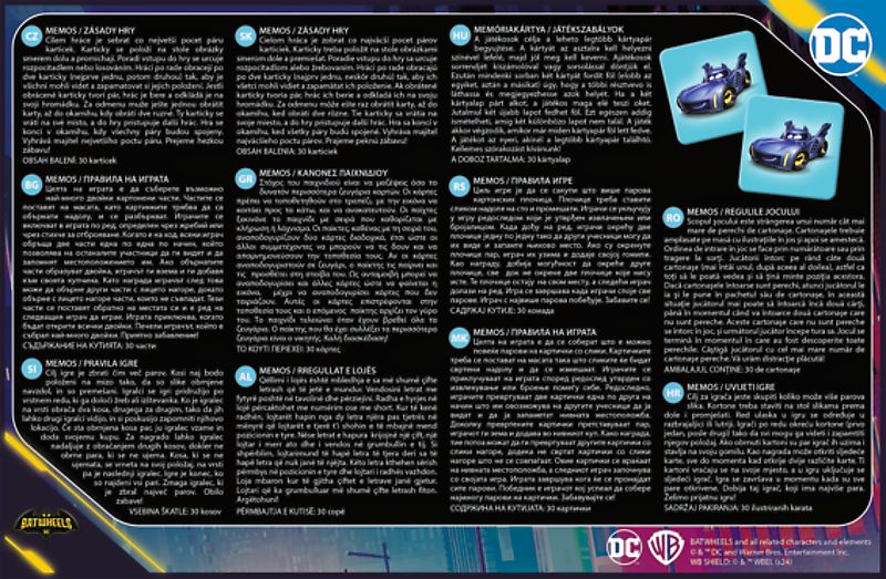 Jocul de memorie DC: Batwheels este alegerea perfecta pentru micii fani ai supereroilor care adora lumea lui Batman si vehiculele cool. Jocul dezvolta intr-un mod captivant si distractiv memoria, atentia si concentrarea copiilor, in timp ce se joaca cu personajele lor preferate din Batwheels. În joc, copiii trebuie sa gaseasca perechile de carti care contin imagini identice. Vehiculele iconice din seria Batwheels, cum ar fi Batmobile, Redbird si Buff, apar pe carti cu grafica colorata si spectaculoasa, permitandu-le celor mici sa se cufunde cu usurinta in lumea palpitanta a orasului Gotham. Datorita regulilor simple ale jocului de memorie, acesta poate fi savurat de la varsta de 3 ani, astfel incat chiar si cei mai mici se pot alatura jocului comun. Ajuta la dezvoltarea memoriei vizuale si a capacitatii de observare, in timp ce copiii se bucura sa caute perechile potrivite. Cartile sunt realizate din carton rezistent, astfel incat sunt durabile si isi pastreaza calitatea pe termen lung. Acest joc de memorie Batwheels este o alegere ideala pentru serile de jocuri in familie, deoarece parintii si fratii se pot alatura cu usurinta, garantand distractia comuna. Este un cadou excelent pentru orice mic fan al lui Batman care iubeste sa invete si sa-si dezvolte abilitatile prin joc. Caracteristici: Design original DC: Batwheels Dezvolta memoria si concentrarea Reguli simple, jucabil de la 3 ani Carton gros si durabil Joc distractiv si educativ.