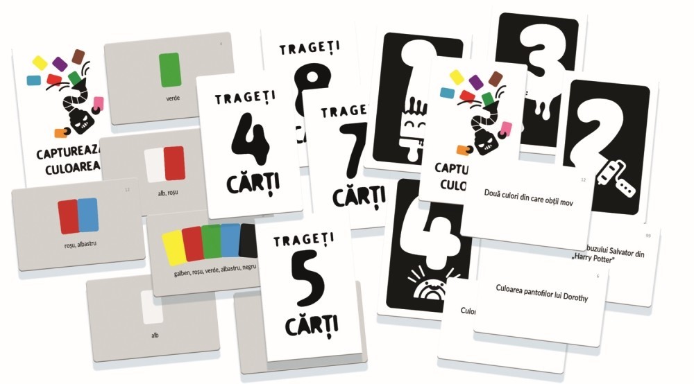 Cum faceti mai interesanta o intrecere cu intrebari noi-noute? Simplu. Le dati tuturor raspunsurile inainte sa inceapa – si toate sunt nume de culori. Începeti cu 11 carti colorate, le alegeti pe cele care raspund la intrebarile noastre sirete si adunati puncte.
