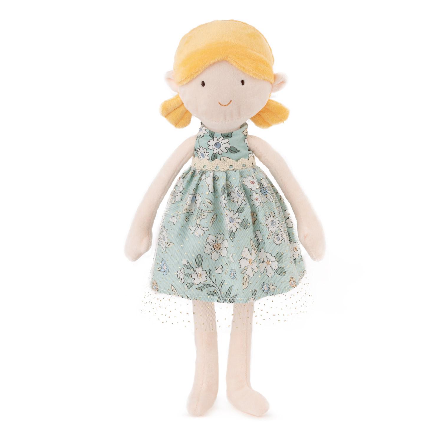 Păpușa de pluș Flora de 35 cm este delicată și adorabilă, perfectă pentru micile visătoare. Poartă o rochiță bleu cu flori, care îi dă un aer vesel și primăvăratic. Ideală pentru joacă sau ca dar special pentru fetițe.
