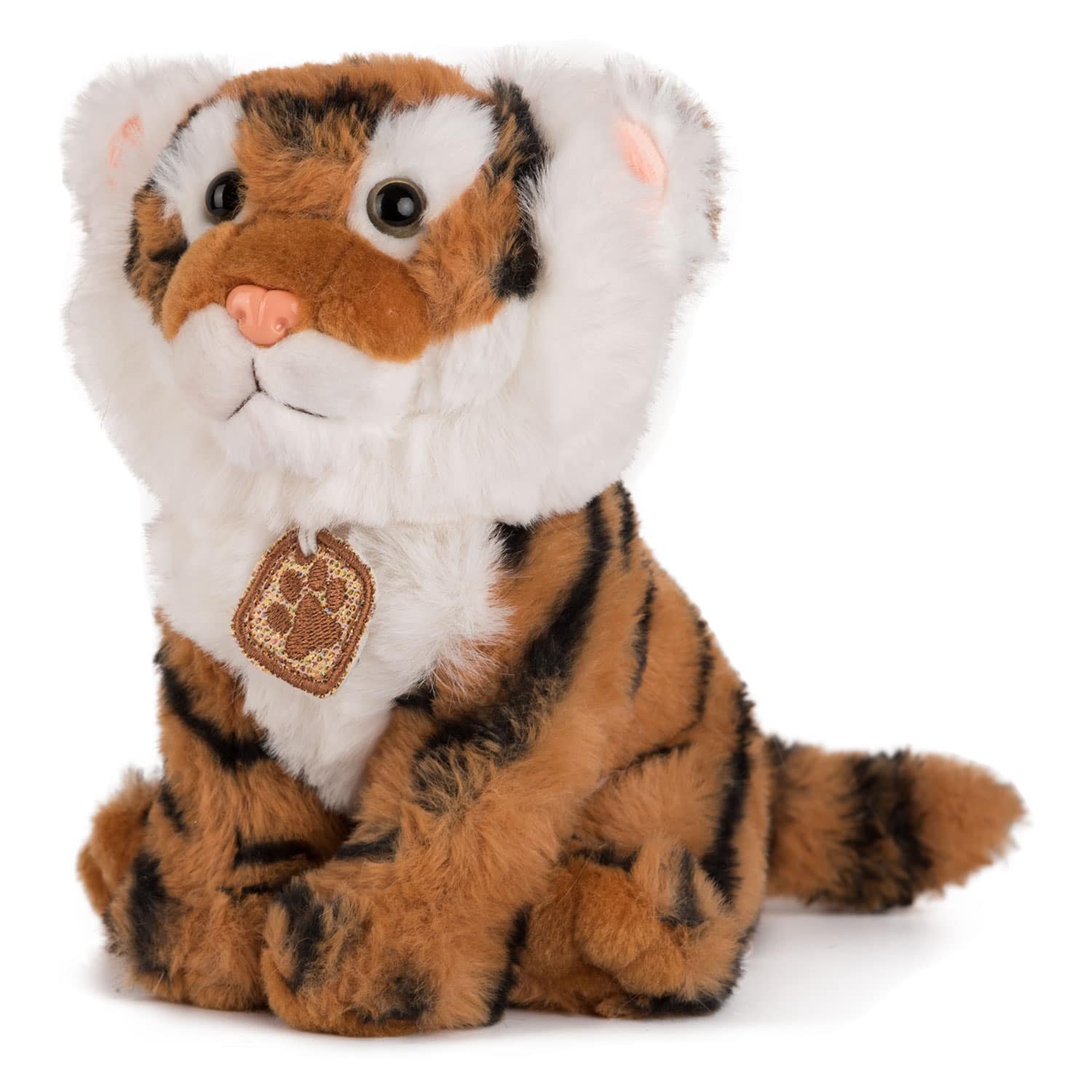 Tigrul de pluș de 28 cm este o jucărie moale și realistă, ideală pentru copiii care iubesc animalele sălbatice. Cu blănița sa pufoasă, dungile fine și medalionul cu lăbuță, emană eleganță și prietenie. Perfect pentru joacă sau ca decor special.