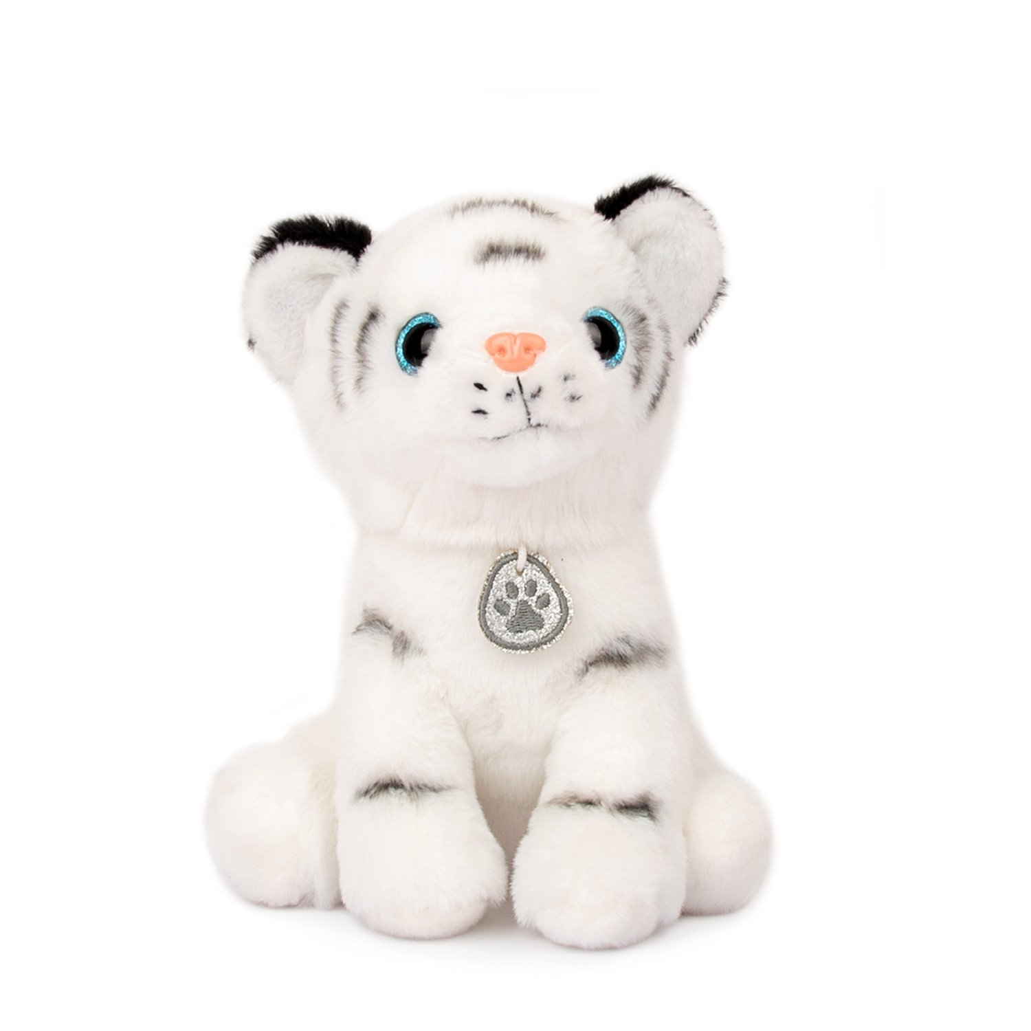 Jucăria de pluș Tigru alb de 23 cm îmbină farmecul sălbatic cu gingășia, devenind un companion de nădejde pentru cei mici. Blănița sa moale, albă cu dungi gri, oferă o senzație plăcută la atingere, iar expresia blândă a feței îi dă un aer prietenos și protector. Medalionul argintiu în formă de lăbuță adaugă o notă distinctivă și elegantă.
