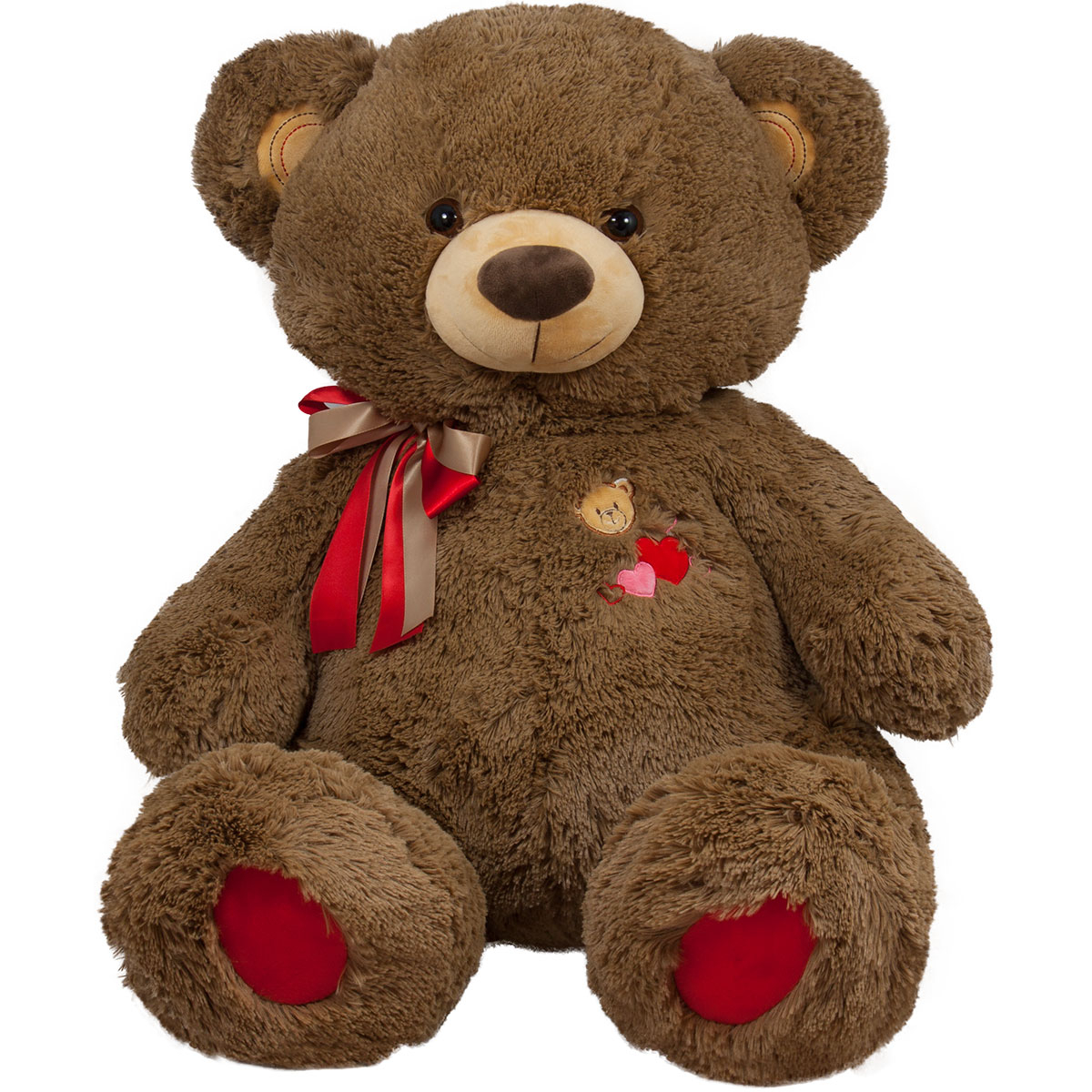 Culoarea caldă de maro este completată de accente roșii la lăbuțe și de o fundiță elegantă din satin, care îi oferă un aer rafinat. Pe piept are o broderie delicată cu un ursuleț mic și inimioare, detaliu ce adaugă un plus de farmec.