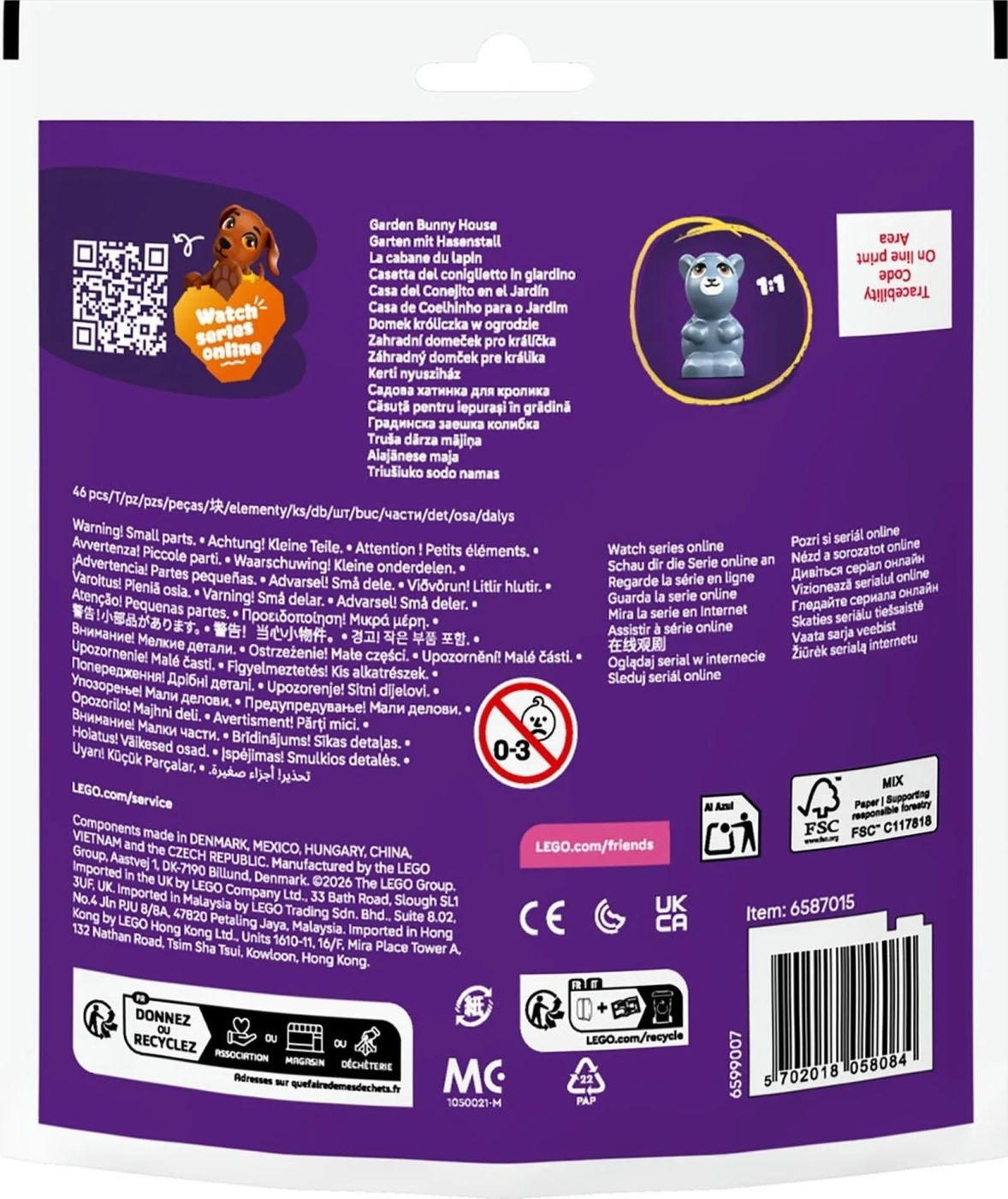 Invita fetele si baietii de 5 ani si mai mari sa creeze povesti distractive alaturi de Paisley si iepurasul ei adorabil, Melody, cu acest set LEGO® Friends Casuta pentru iepuras (30722). Setul este ideal pentru joaca fantezista si incurajeaza copiii sa imagineze scene pline de grija, prietenie si aventuri in aer liber. Casuta pentru iepuras este plina de detalii dragute si este completata de accesorii care imbogatesc experienta de joaca. Setul include o minipapusa Paisley, un iepuras simpatic si elemente care permit copiilor sa recreeze momente din via. Cu o constructie simpla, potrivita varstei, acest mic set LEGO Friends este perfect ca surpriza sau cadou si poate fi combinat cu alte seturi din universul LEGO Friends pentru si mai multa distractie. Setul contine 46 de piese.
