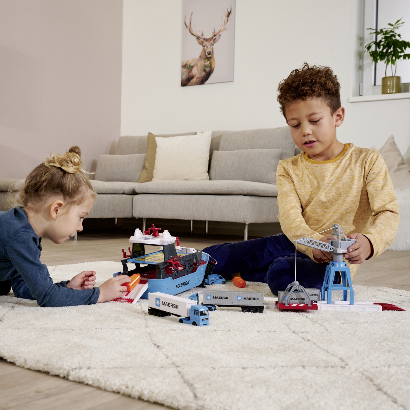 Statie portuara logistica Maersk (45x29x24 cm) cu nava de marfa, macara mobila si camion MAN cu container, pentru copii de la 5 ani. În cel mai scurt timp, camera copiilor se transforma intr-un port de transbordare in care copiii de la 5 ani in sus sunt ocupati sa descarce camioane si sa trimita marfurile peste mare cu o nava de marfa. Ca si in cazul unui cargo real, containerele si chiar masinile intregi sunt transportate pe nava cu macaraua controlabila manual sau prin rampa de incarcare pliabila. Încarcata cu masini sau cu jucaria ta preferata, conduceti barca prin cada. 2 barci de salvare cad in apa folosind functia de inclinare si sunt prinse din nou cu ajutorul unui troliu cu cablu.Pe langa nava si statia portuara cu macara mobila, setul extins de joaca contine si un model de masina Maersk din metal cu licenta oficiala: un camion MAN TGX cu un container de 20 ft!