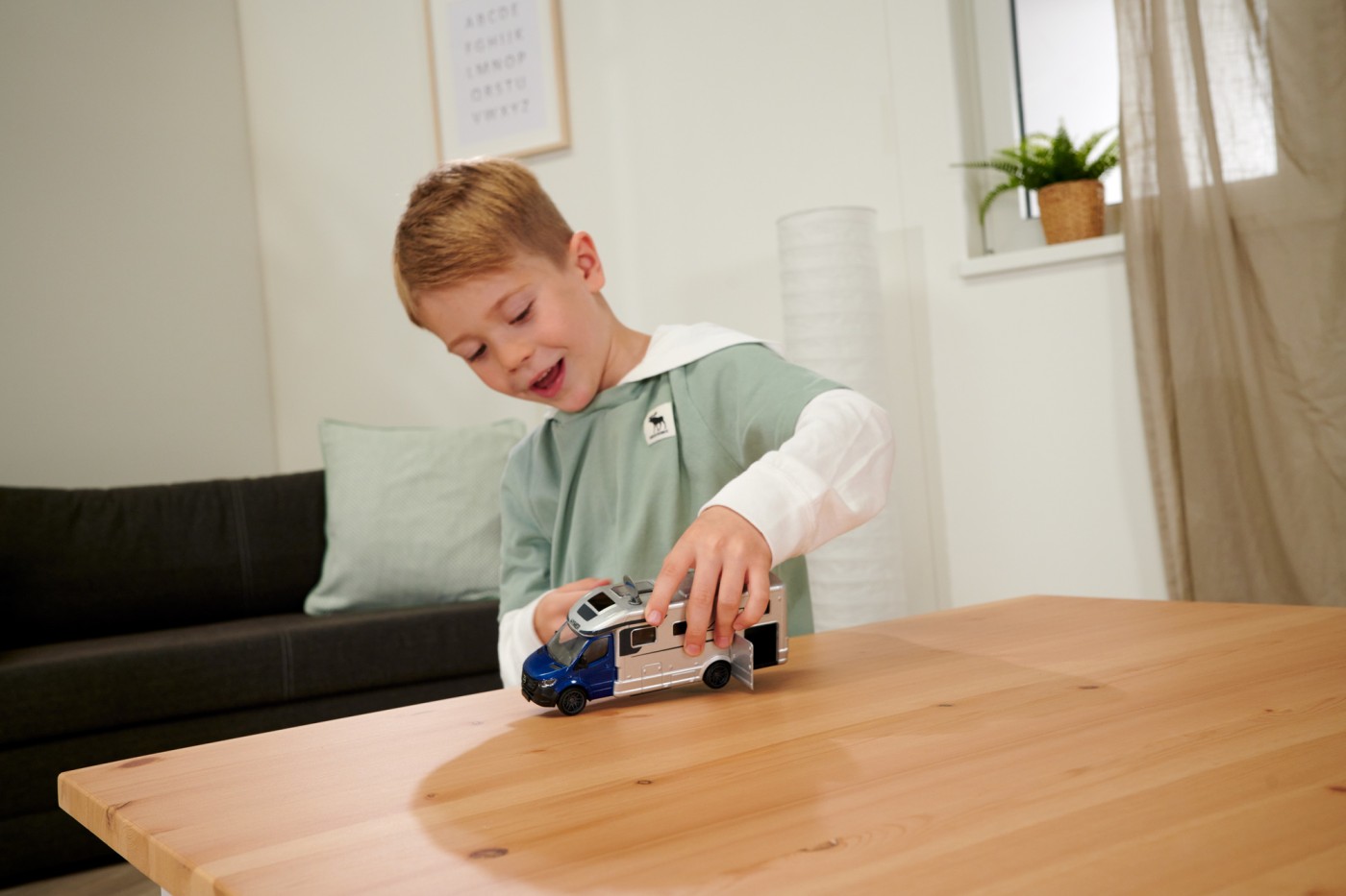 Majorette – Camper van HYMER B-Class MasterLine – rulota premium la scara 1:43, vehicul de jucarie pentru colectionari si copii cu varsta de 3 ani si peste. Proiectat pe baza vehiculului original, modelul are o multime de functii practice si realiste pentru a va distra, inclusiv doua efecte sonore diferite, doua faruri si iluminare interioara. De asemenea, dispune de anvelope din cauciuc moale, cu un model de benzi de rulare, ferestre transparente si antena de satelit rotativa pliabila. Atat cabina soferului, cat si sectiunea de rulota sunt realizate din metal. Celelalte parti sunt fabricate din plastic.