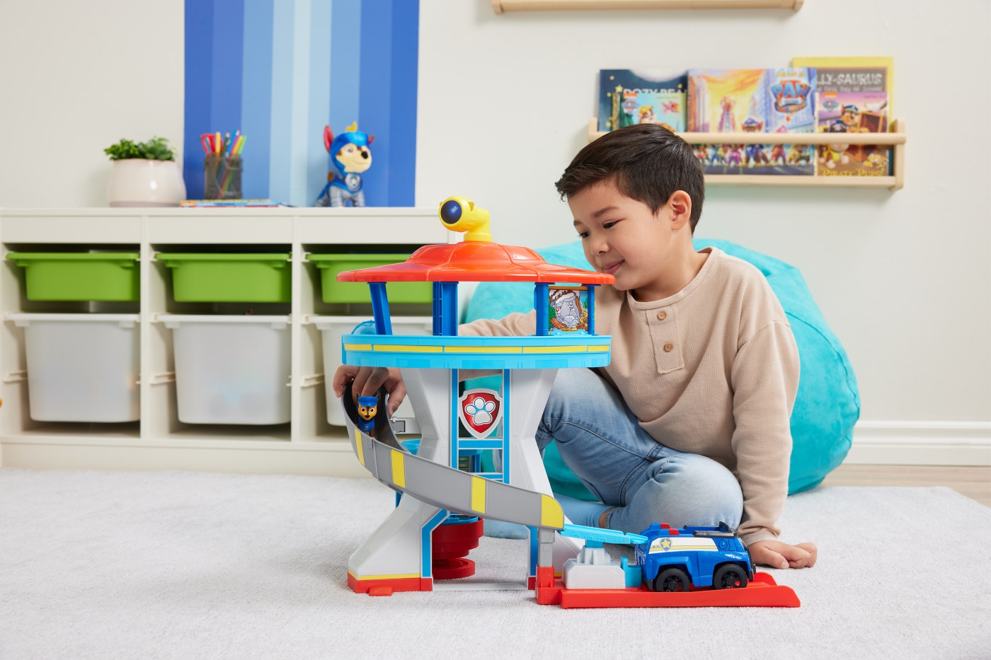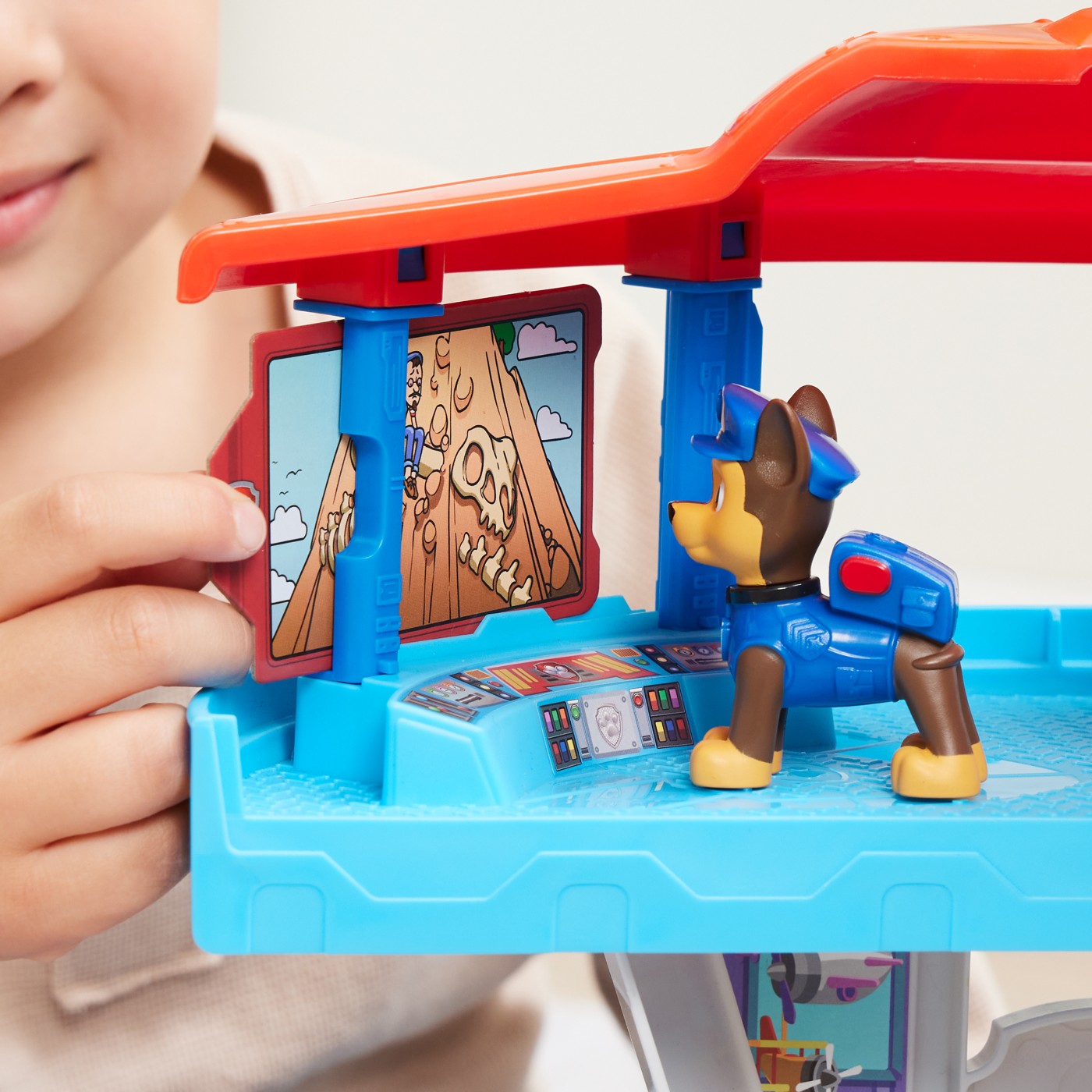 Chase este gata de actiune in setul de joc Turnul de observatie Patrula Catelusilor. Acest set de joaca exclusiv include Turnul de observatie din serial, alaturi de crucisatorul de politie al lui Chase si doua figurine de actiune Chase – Chase in timpul Liber si Chase Catelusul Erou. Cu o inaltime de 50,8 cm, turnul de observatie este locul perfect din care poti vedea orice fel de probleme care apar. Atunci cand este nevoie sa pornesti intr-o misiune de salvare interesanta, pune figurina Chase in timpul liber in fata liftului turnului si figurina Chase Catelusul Erou in spatele liftului. Ridica liftul pentru a-l face sa se roteasca si priveste cum Chase aflat in timpul liber se pregateste de actiune in timp ce se transforma in Chase eroul. Odata ce se afla in varful Turnului de observatie, treci la panoul de control al misiunii pentru a-ti selecta detaliile misiunii pentru ziua respectiva, alegand una dintre cele 3 carti de misiune cu doua fete. Dupa ce ai selectat cardul de misiune, alege una dintre cele 3 carti cu periscop cu doua fete, pentru a vedea prin periscopul turnului, astfel incat sa stii unde veti merge. Atunci cand este timpul pentru o super misiune de salvare, gliseaza-l pe Chase in jos pe toboganul turnului pentru a sari direct in crucisatorul de politie, iar apoi apasa pe lansatorul de vehicul si pleaca in actiune. Pentru si mai multe moduri de joc, colectioneaza restul puilor uimitori din Patrula, precum Marshall, Skye si Rubble, impreuna cu vehiculele lor de baza, pentru a avea parte de aventuri si mai interesante in timpul jocului. Cu jucariile Patrula Catelusilor, copiii isi pot explora imaginatia si isi pot dezvolta abilitatile motorii, prin jocuri de simulare, in timp ce aduc la viata scenele preferate din serial. Figurinele de actiune, masinile de jucarie, seturile de joaca si animalele de plus Patrula Catelusilor sunt jucariile perfecte pentru baietii si fetele cu varsta de cel putin 3 ani. Ia acasa chiar astazi entuziasmul Patrulei Catelusilor.