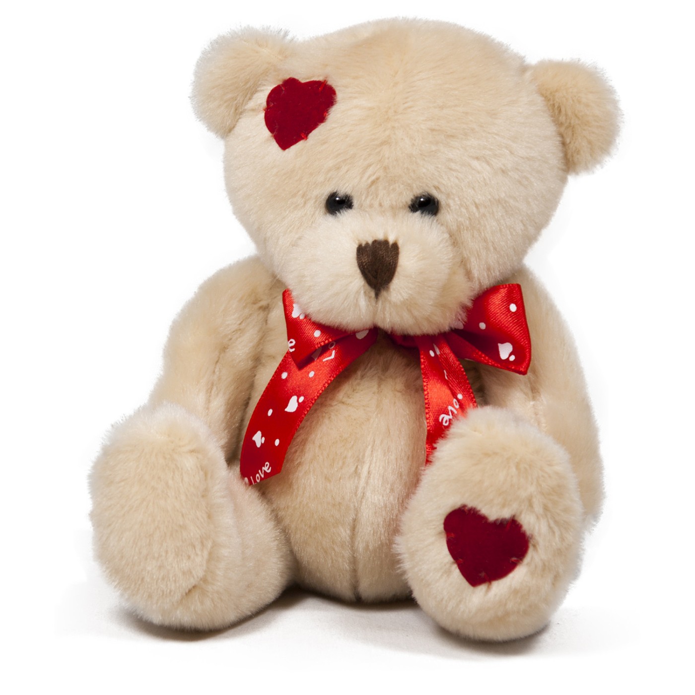 Un ursulet de plus bej deschis, cu o blanita moale si pufoasa, sta asezat intr-o pozitie prietenoasa, parca asteptand o imbratisare. Ochii negri, mici si luciosi, impreuna cu nasul maro inchis, brodat in forma de inimioara, ii confera o expresie dulce si inocenta. O funda rosie aprinsa, cu mici buline albe si cuvantul "Love" scris in alb de mai multe ori, ii inconjoara gatul, adaugand o nota vibranta de culoare si un mesaj clar. Doua petice rosii in forma de inima, unul aplicat pe urechea stanga si celalalt pe piciorul drept, completeaza designul adorabil si subliniaza tema dragostei. Umplutura moale si pufoasa il face perfect pentru a fi imbratisat si alintat.