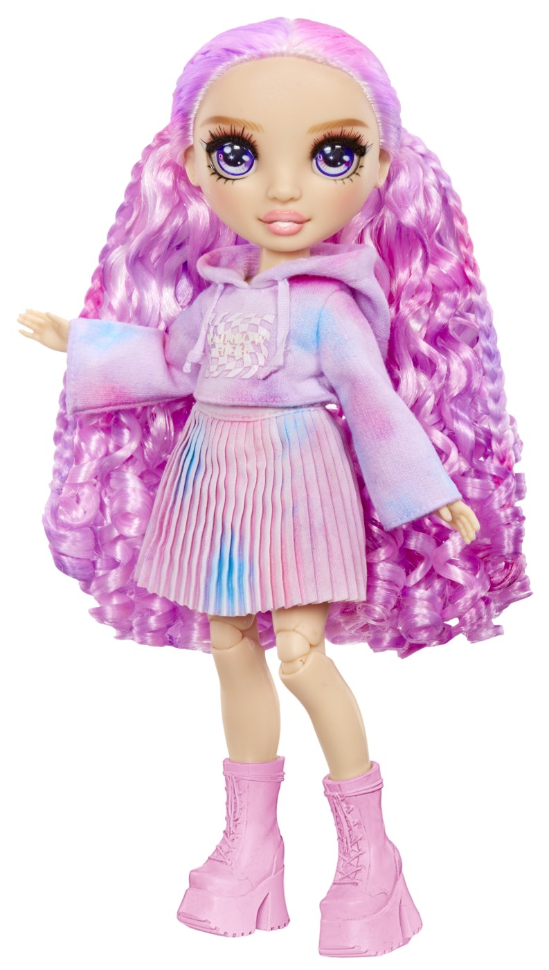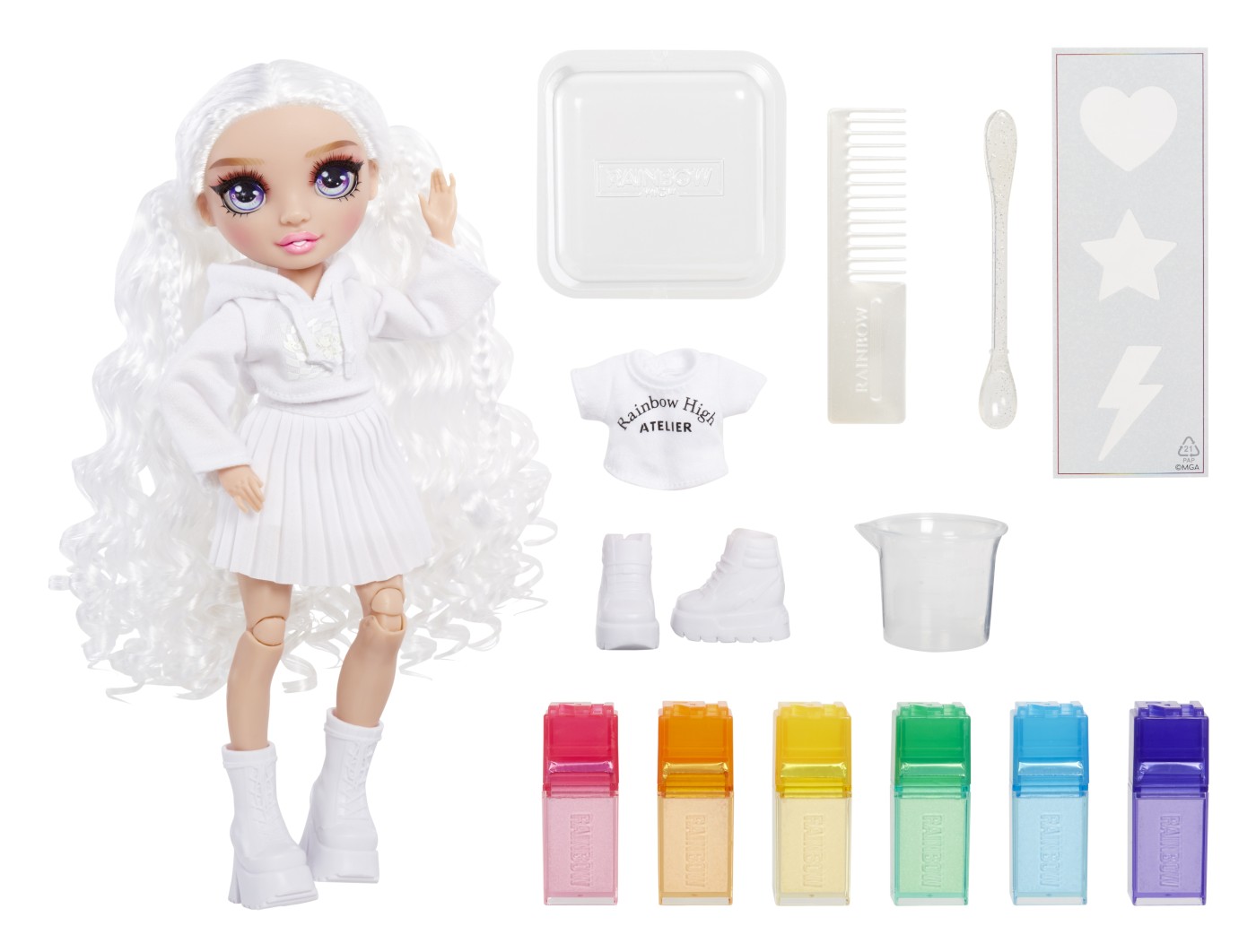 Rainbow High Watercolor & Create face extrem de usor sa-ti creezi propria papusa personalizata Rainbow High in multe moduri diferite, inclusiv cu Tie-Dye! Poti folosi acuarelele lavabile si pe propriul par! Apoi, doar clateste si repeta pentru a crea din nou. Adauga apa in cele 6 pulberi colorate pentru a crea acuarele, apoi coloreaza hainele si parul. Include 6 culori (roz, portocaliu, galben, verde, albastru si violet) pentru a face atat de multe desene colorate. Este atat de simplu! Pentru desene precise, aplica acuarelele folosind buretele cu doua capete direct pe haine si par. Atatea moduri de a te distra! Include elastice pentru a crea modele amuzante de tie-dye - spirale, straturi si multe altele. Sabloanele fac usor sa creezi forme amuzante pe par si haine. In plus, fata de papusa imbracata intr-o tinuta alba (hanorac cu gluga, fusta pliata si pantofi albi), primesti si un tricou si pantofi bonus. Este atat de usor sa repeti procesul. Pur si simplu spala cu apa si sapun, lasa sa se usuce si incepe din nou sa creezi! Coloreaza-ti si tu parul! Doar aplica pe suvite pentru a adauga culoare parului tau. Nota: culoarea va fi mai vibranta pe parul mai deschis! Papusa Watercolor & Create are par lung si frumos cu bucle si o impletitura in partea de sus, gene lungi si ochi din sticla. Colectioneaza intreaga gama de papusi Watercolor & Create. Este inclusa 1 papusa exclusiva cu o tinuta complet alba si incaltaminte pentru papusa plus tricou si pantofi bonus, 6 acuarele lavabile colorate, burete cu doua capete, elastice, sablon, pahar de masurare, bol de unica folosinta, lingura si pieptene. Fiind complet articulata, este super distractiva si usor de personalizat. Capul, bratele, mainile si picioarele se indoaie pentru multe pozitii amuzante, inclusiv spagatul! O poti expune pe suportul inclus pentru papusa.