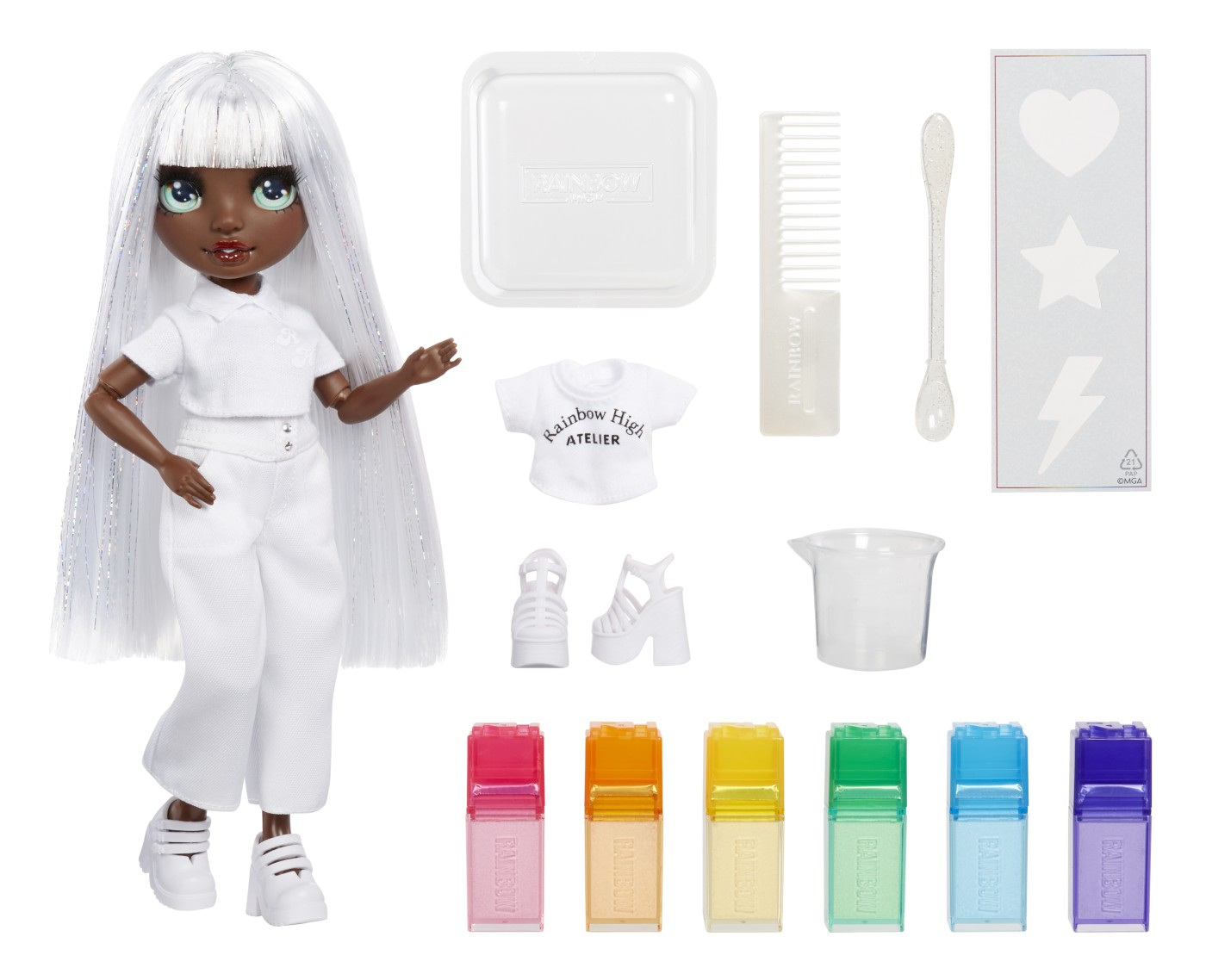 Rainbow High Watercolor & Create face extrem de usor sa-ti creezi propria papusa personalizata Rainbow High in multe moduri diferite, inclusiv cu Tie-Dye! Poti folosi acuarelele lavabile si pe propriul par! Apoi, doar clateste si repeta pentru a crea din nou. Adauga apa in cele 6 pulberi colorate pentru a crea acuarele, apoi coloreaza hainele si parul. Include 6 culori (roz, portocaliu, galben, verde, albastru si violet) pentru a face atat de multe desene colorate. Este atat de simplu! Pentru desene precise, aplica acuarelele folosind buretele cu doua capete direct pe haine si par. Atatea moduri de a te distra! Include elastice pentru a crea modele amuzante de tie-dye - spirale, straturi si multe altele. Sabloanele fac usor sa creezi forme amuzante pe par si haine. In plus, fata de papusa imbracata intr-o tinuta alba (tricou alb, pantaloni si pantofi albi), primesti si un tricou si pantofi bonus. Este atat de usor sa repeti procesul. Pur si simplu spala cu apa si sapun, lasa sa se usuce si incepe din nou sa creezi! Coloreaza-ti si tu parul! Doar aplica pe suvite pentru a adauga culoare parului tau. Nota: culoarea va fi mai vibranta pe parul mai deschis! Papusa Watercolor & Create are par lung si drept cu breton scurt, gene lungi si ochi din sticla. Colectioneaza intreaga gama de papusi Watercolor & Create. Este inclusa 1 papusa exclusiva cu o tinuta complet alba si incaltaminte pentru papusa plus tricou si pantofi bonus, 6 acuarele lavabile colorate, burete cu doua capete, elastice, sablon, pahar de masurare, bol de unica folosinta, lingura si pieptene. Fiind complet articulata, este super distractiva si usor de personalizat. Capul, bratele, mainile si picioarele se indoaie pentru multe pozitii amuzante, inclusiv spagatul! Sau o poti expune pe suportul inclus pentru papusa.