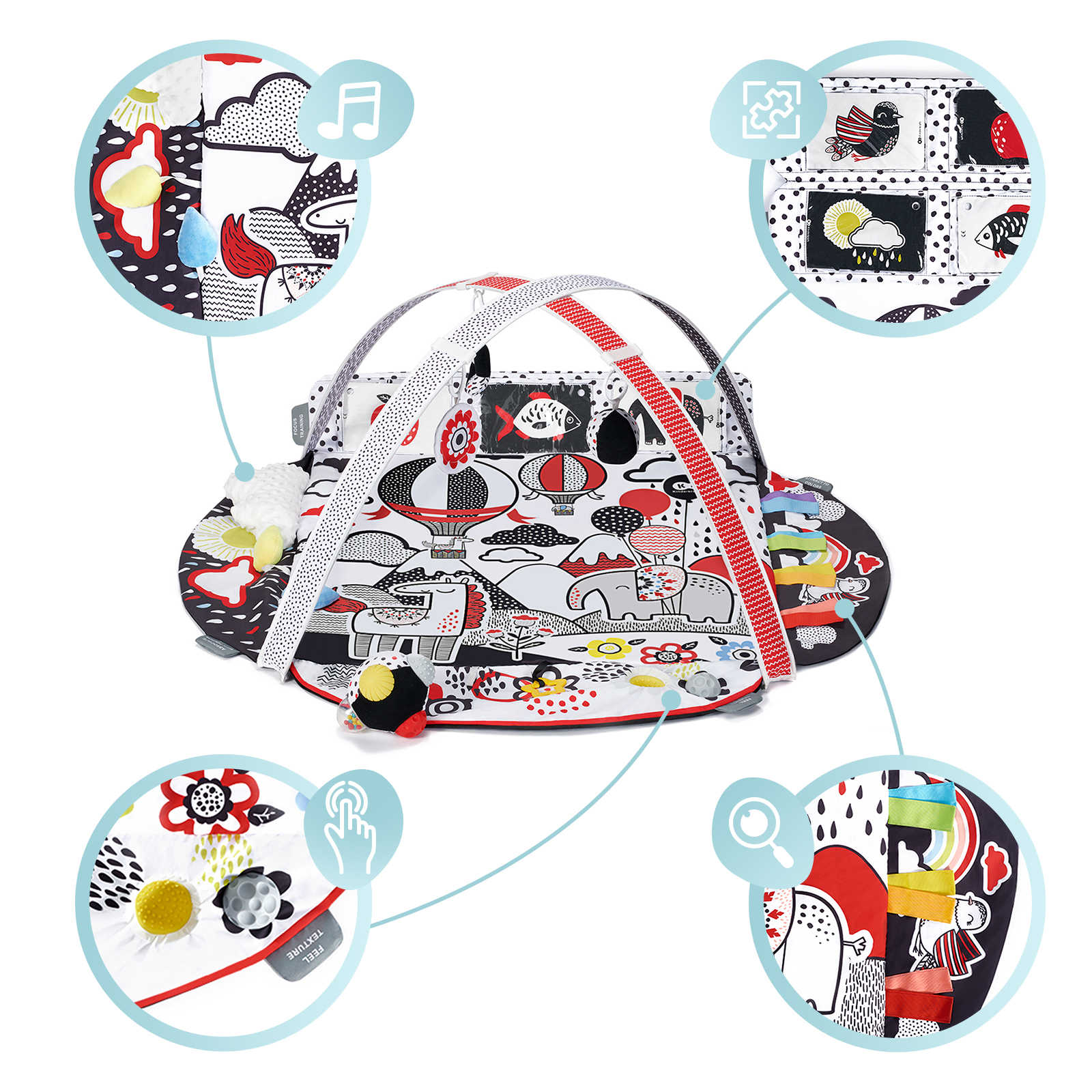 Covoras interactiv Kinderkraft 4SMART MULTICOLOR Covorasul interactiv cu contrast cromatic Kinderkraft 4SMART, cu 4 zone de interactiune ce sprijina dezvoltarea copilului, este destinat copiilor din primele luni de viata. În primele luni de viata, copiii percep doar culorile contrastante. Pentru a stimula imaginatia celui mic si a-i sprijini dezvoltarea din primele luni, am creat covorasul Kinderkraft 4SMART in culori clare, contrastante. Kinderkraft 4SMART are 4 zone care dezvolta: vazul, atingerea, auzul si concentrarea. Zona 1 dezvolta vazul: este decorata in culori contrastante - negru, alb si rosu cu accente galbene. Are panglici colorate, care atrag atentia copilului si il ajuta sa deosebeasca culorile. Zona 2 dezvolta auzul: are elemente care fosnesc si zornaie, ce il obisnuiesc pe cel mic cu diverse sunete. Copilul este liber sa le stranga in mana si sa le atinga. Zona 3 dezvolta atingerea: aici se afla elemente tridimensionale cu diverse texturi, datorita carora copilul isi stimuleaza simtul tactic si descopera noi forme si texturi. Zona 4 ii ajuta pe cei mici sa isi dezvolte puterea de concentrare: covorasul are locuri speciale pentru introducerea cartonaselor contrastant colorate si oglinzii. Aceste elemente capteaza atentia copilului si il invata sa se concentreze asupra unei anumit activitati. Setul include 2 stalpi cu o agatatoare ce gliseaza, de care se pot atarna si muta dupa dorinta jucariile incluse: 12 cartonase educative Kinderkraft 4SMART, o oglinda suspendata, minge de atarnat care zornaie, jucarie de atarnat care fasaie, minge senzoriala, jucarie de plus, panglici colorate, bile zornaitoare si oglinda, care se pot introduce in spatele foliei. Cartonasele se afla pe un inel – se pot atasa de carucior sau de ghiozdan, de exemplu. În plus, setul contine si o minge senzoriala. Este mare, are diferite culori, butoane si desene, datorita carora va atrage privirea copilului si ii va oferi multa bucurie. Imprimeul interesant, stilistica si multifunctionalitatea fac din el covorasul ideal pentru fiecare copil. Avantaje: Functionalitate: Covorasul a fost proiectat cu gandul la cei mai mici copii, care inca nu recunosc culorile si contrastele majore. De aceea, principalele culori ale covorasului sunt cele puternice: negru, alb si rosu cu accente galbene. Are 4 zone de dezvoltare: vaz: zona cu culori contrastante. Covorasul are panglici colorate si culori, care atrag privirea si atentia copilului, auz: elemente care fosnesc si zornaie, care atrag atentia copilului si obisnuiesc copilul cu diferite sunete, atingere: zona cu elemente tridimensionale (snururi si mingi) cu diverse texturi, astfel incat copilul sa le poate atinge si sa-si stimuleze simtul tactil, concentrare: covorasul are un loc special pentru a introduce cartonasele contrastante si oglinda. Setul include multe jucarii care stimuleaza simturile: 12 cartonase contrastante, oglinda suspendata, mingea de atarnat care zornaie, jucarie de atarnat care fasaie, minge senzoriala, jucarie de plus, panglici colorate, bile zornaitoare si oglinda, care se pot introduce in spatele foliei. Cartonasele se pot lua la plimbare – cartonasele Kinderkraft 4SMART au un carlig special cu care pot fi agatate, de exemplu, de carucior. Setul include si o minge senzoriala mare, care stimuleaza imaginatia copilului si ii aduce acestuia multa bucurie. Imprimeul interesant si stilistica il fac un covoras ideal pentru fiecare copil. Covorasul educativ Kinderkraft 4SMART este ideal pentru un cadou – este multifunctional, si in plus are si un ambalaj deosebit. În plus, este un cadou practic: dezvolta simturile copilului, ii stimuleaza imaginatia si ii va servi pentru mult timp. Confort: Covorasul are stalpi reglabilidotate cu o agatatoare care gliseaza usor, iar jucariile care atarna sunt usor de miscat si asezat oriunde. Covorasul este usor si simplu de impaturit (dupa desprinderea stalpilor). Îl poti lua cu tine in vacanta fara nicio problema! Murdaria nu va fi o problema – covorasul este foarte usor de curatat. Baza covorasului se poata spala manual, iar restul jucariilor sunt usor de curatat cu o carpa. Siguranta: Covorasul interactiv Kinderkraft 4SMART izoleaza bine fata de podea. Covorasul este potrivit pentru copii inca din primele zile de viata – indeplineste standardele EN 71-1, EN 71-2, EN 71-3 pentru jucarii si covorasele educative. Este realizat cu atentie – cusaturile puternice si lipsa elementelor proeminente, usor de desprins sporesc siguranta copilului. Constructie: Materiale: Covorasul: poliester Jucariile: poliester, plastic Cartonasele: hartie Dimensiuni: 128 cm x 116 cm, Înaltimea de la sol pana la stalpi 46,5 cm Dimensiunile covorasului cu marginile desfacute: 126 x 112 Dimensiunile covorasului cu marginile pliate: 75x75 Dimensiunile cartonaselor: 12x19 Greutate: 1,1 kg Dimensiunile ambalajului/greutate: 65 cm x 46 cm x 10 cm/1,6 kg