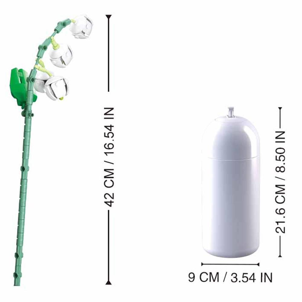 Vaza inclusă are dimensiunile de 9cm x 9cm x 21.6cm și completează perfect ansamblul floral, oferindu-i stabilitate și un design modern. Acest set este ideal atât pentru momente de relaxare creativă, cât și ca idee de cadou inspirată pentru pasionații de construcții și decorațiuni florale.