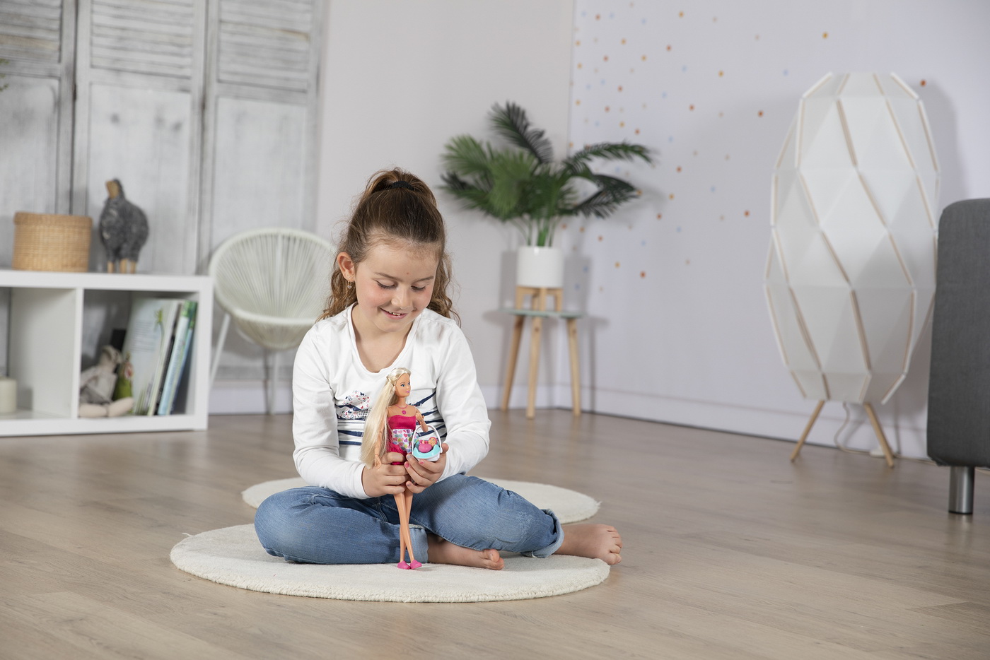 Papusa Steffi este insarcinata si asteapta cu nerabdare nasterea copilului. Dupa nastere, burtica voluminoasa poate fi usor indepartata si inlocuita cu o burta plata. Pe parcursul sarcinii si dupa nastere bebelusul va scoate anumite sunete reale, bataile inimii, rasul sau plansul unui copil. Setul include si un scaun auto si un certificat de nastere pentru bebelus .